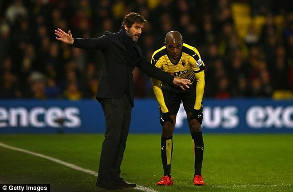 | Huấn luyện viên Flores ra sát đường biên dọc để dặn học trò Allan Nyom. Mùa này, Watford là tân binh thi đấu ấn tượng nhất Premier League. |