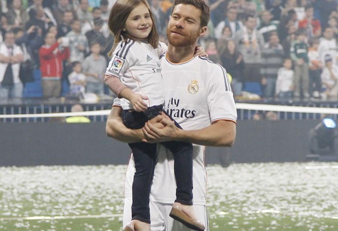 | Tiền vệ Xabi Alonso chia vui cùng con gái. Ở trận đấu tại Lisbon, cựu ngôi sao của Liverpool không được tham dự vị án treo giò (lĩnh đủ số thẻ vàng). |
