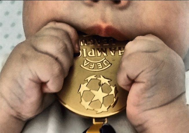 | Nhóc tì Martin đang "kiểm tra chất lượng" danh hiệu vô địch Champions League của ông bố nổi tiếng. |