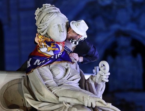 | Người hùng trong trận chung kết Sergio Ramos hôn nữ thần Cibeles sau khi từ Lisbon trở lại Madrid. |