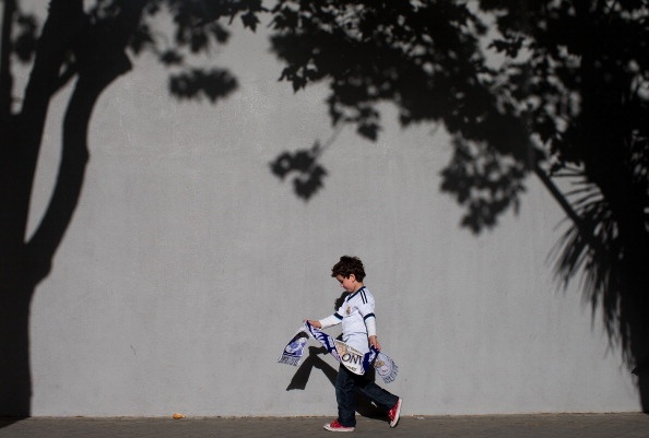| Một fan nhí Real tung tẩy với tâm trạng vui sướng sau khi tham dự lễ hội cùng bố mẹ tại Bernabeu. |