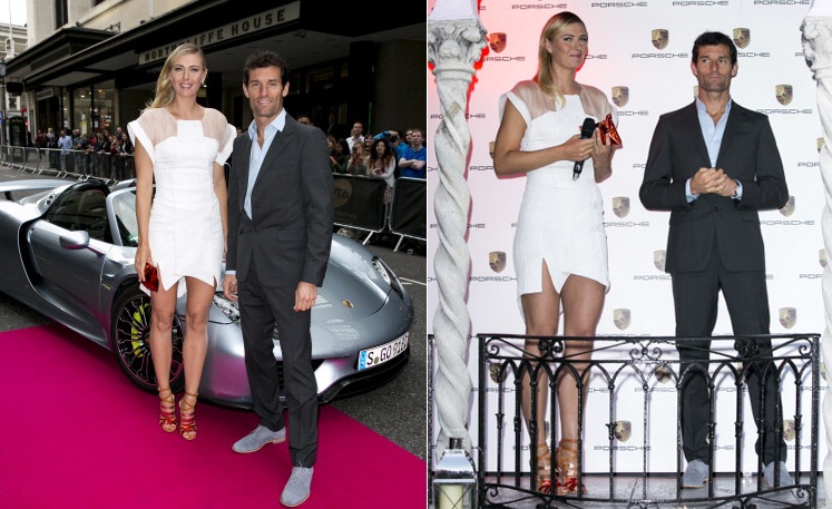 | Nhân buổi tiệc do Dubai Duty Free tổ chức tại khách sạn Kensington Roof Gardens (London), Sharapova sánh đôi bên cựu tay đua F1 Mark Webber. |