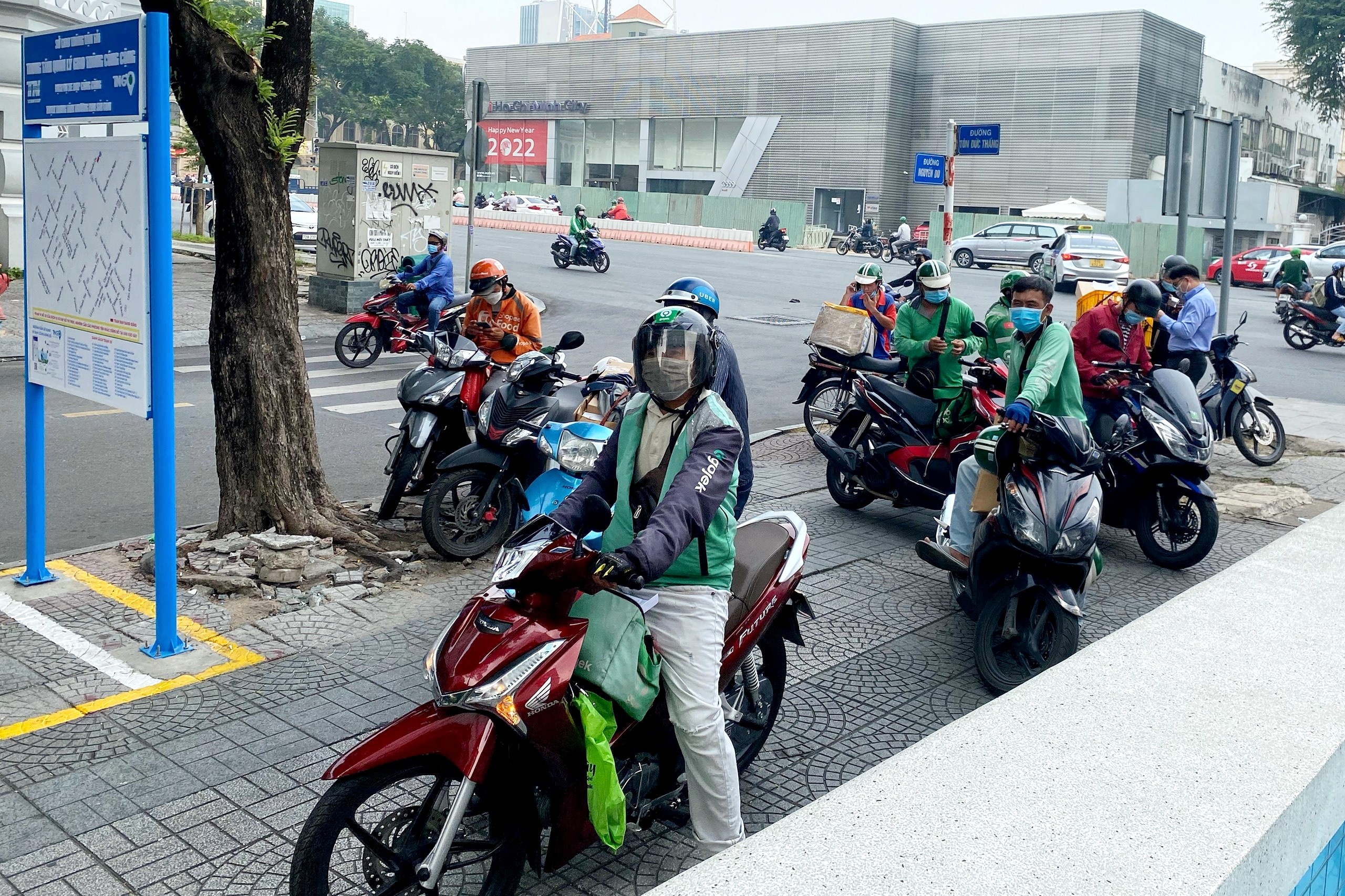 12h, hơn 10 shipper tấp xe trên vỉa hè ở góc đường Tôn Đức Thắng giao Nguyễn Du (quận 1). Hầu hết đều đợi giao thức ăn cho các nhân viên văn phòng làm việc trong tòa nhà Saigon Trade Center.