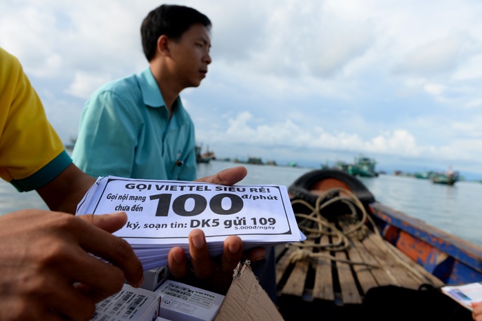 Nhân viên Viettel chi nhánh Kiên Giang thuê xuồng đi bán hàng trên biển tại các khu vực đảo Phú Quốc, Thổ Chu để phục vụ ngư dân. Đây là tổ bán hàng điện thoại độc nhất trên biển.