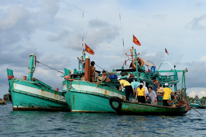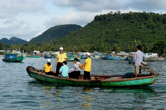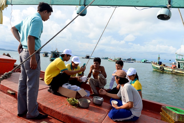 | Đây là tổ nhân viên bán hàng tại huyện đảo Phú Quốc. Họ thuê ghe hoặc xuồng đi từ bờ ra xa, tìm đến các khu vực có thuyền đánh cá của ngư dân đang đậu bến nghỉ ngơi để tiếp cận. |