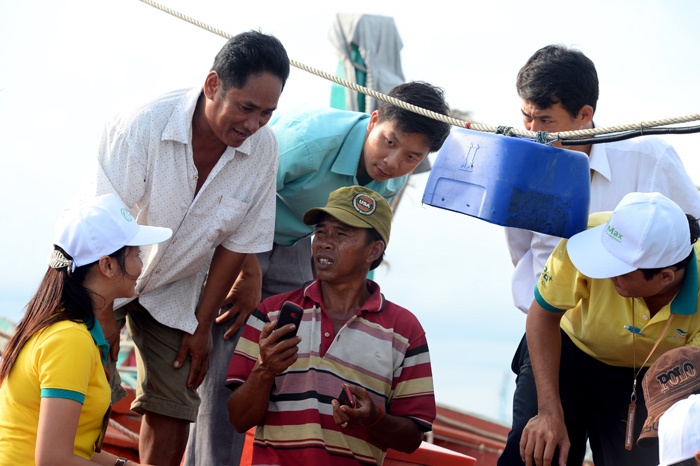 | Các ngư dân thấy lạ khi có cả dịch vụ bán điện thoại lưu động trên biển. Tất cả đều dừng tay để chờ đón. |