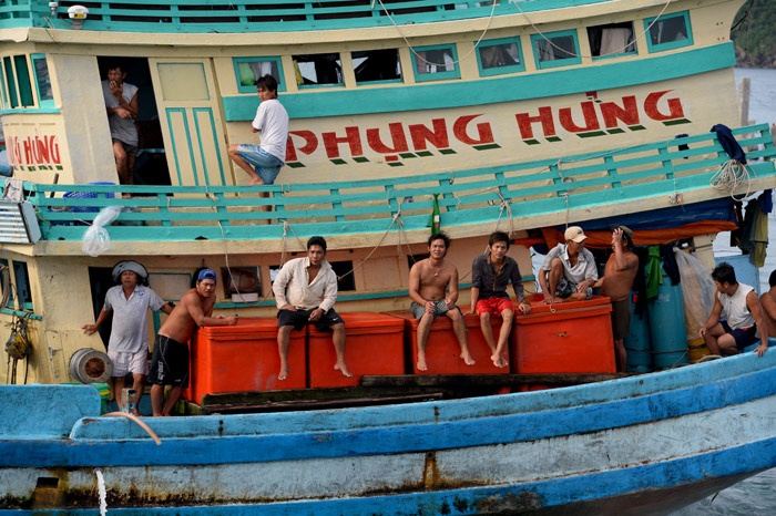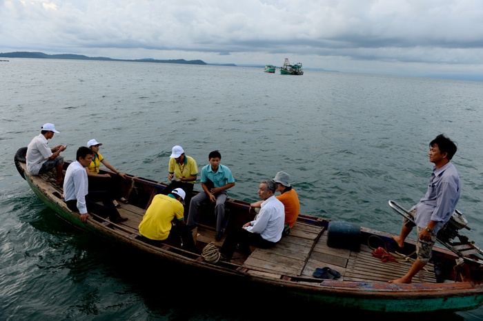 | Tại vùng đánh cá gần bờ bắc đảo Phú Quốc còn có một số tàu bè của người Campuchia. Trong ảnh là một ngư dân láng giềng của Việt Nam đang hỏi về chức năng của điện thoại. Các anh dùng cả mạng trong nước và ngoài nước để tiện liên lạc, cần sự trợ giúp của bất kỳ ai có thể khi gặp khó khăn ở ngoài khơi xa. |