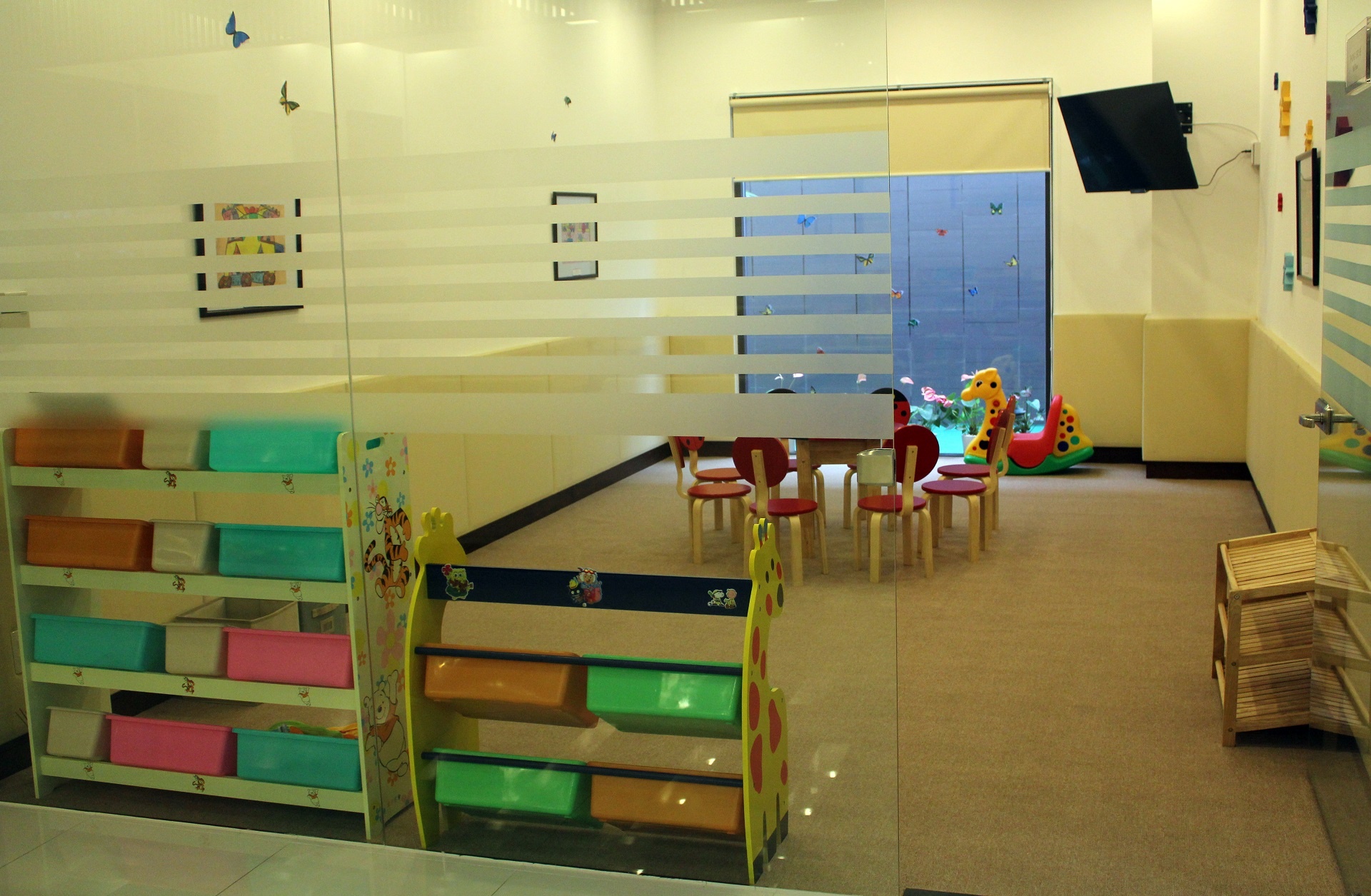 Đối diện phòng chờ là khu vui chơi cho trẻ nhỏ, các bậc phụ huynh dễ dàng theo dõi con mình khi ngồi ở phòng chờ nhờ thiết kế vách kính.