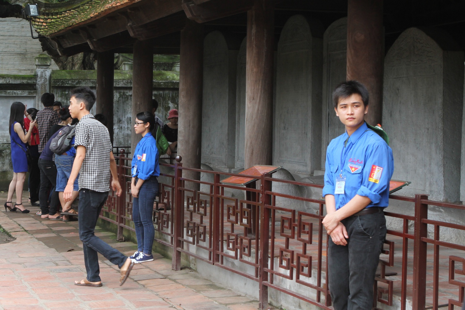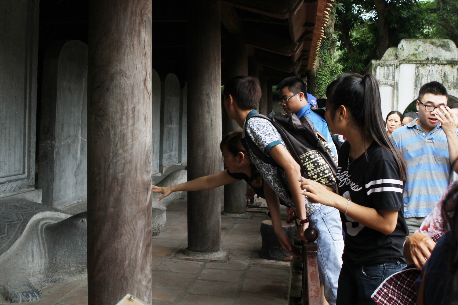 | Sau khi lập hàng rào sắt, khu bia tiến sĩ vẫn cần sự bảo vệ của lực lượng thanh niên tình nguyện để ngăn chặn hành vi trèo vào trong sờ đầu rùa cầu may. |