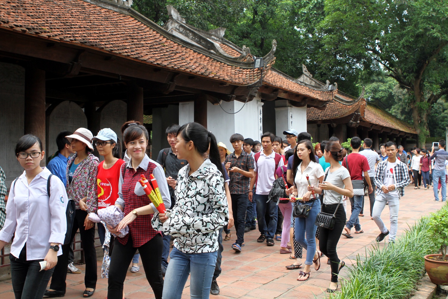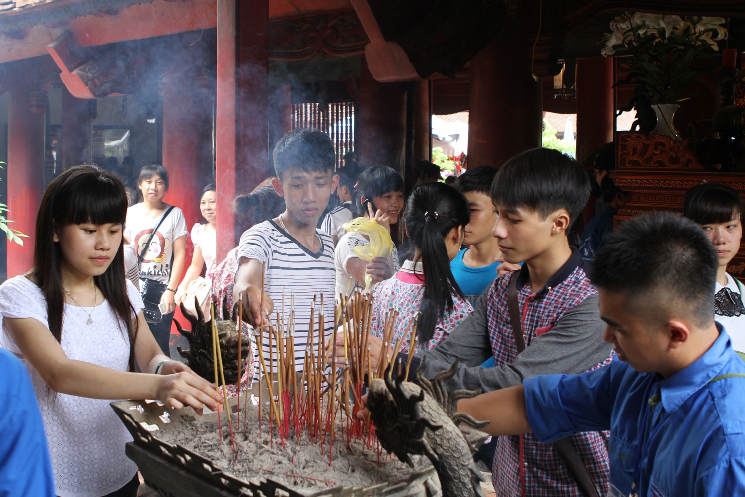 | 10h đến 11h sáng 1/7, các sĩ tử và phụ huynh bắt đầu kéo đến Văn Miếu du ngoạn, đồng thời thắp hương cầu may. |