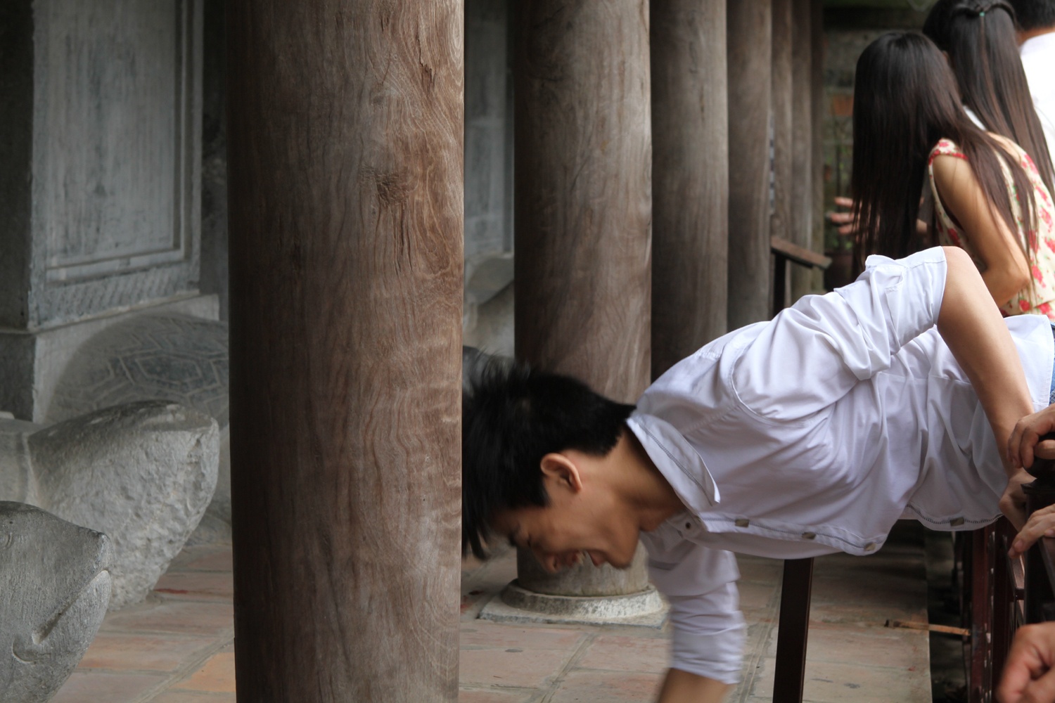 | Một học sinh trong chiếc áo đồng phục trường THPT Đống Đa (Hà Nội) đứng chắp tay khấn tại điện thờ thầy giáo Chu Văn An khá lâu. |