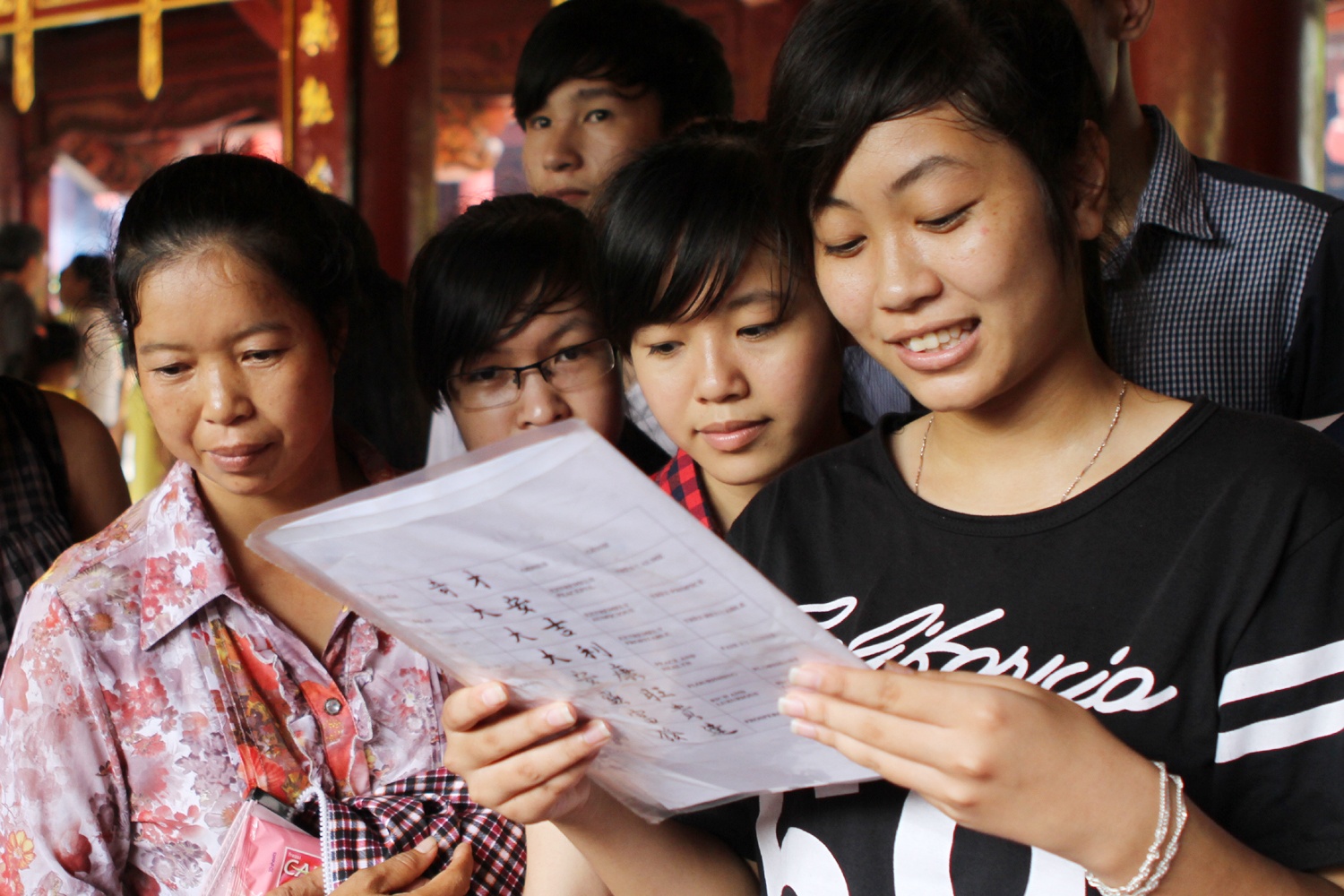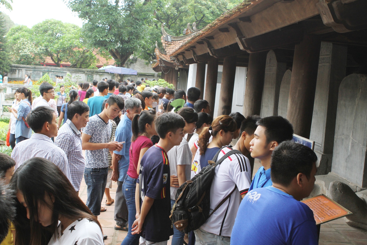 | Nhiều sĩ tử lần đầu được đặt chân đến trường đại học đầu tiên của Việt Nam nên không tránh khỏi việc chen chân đọc từng vần chữ trên tấm biển giới thiệu. |