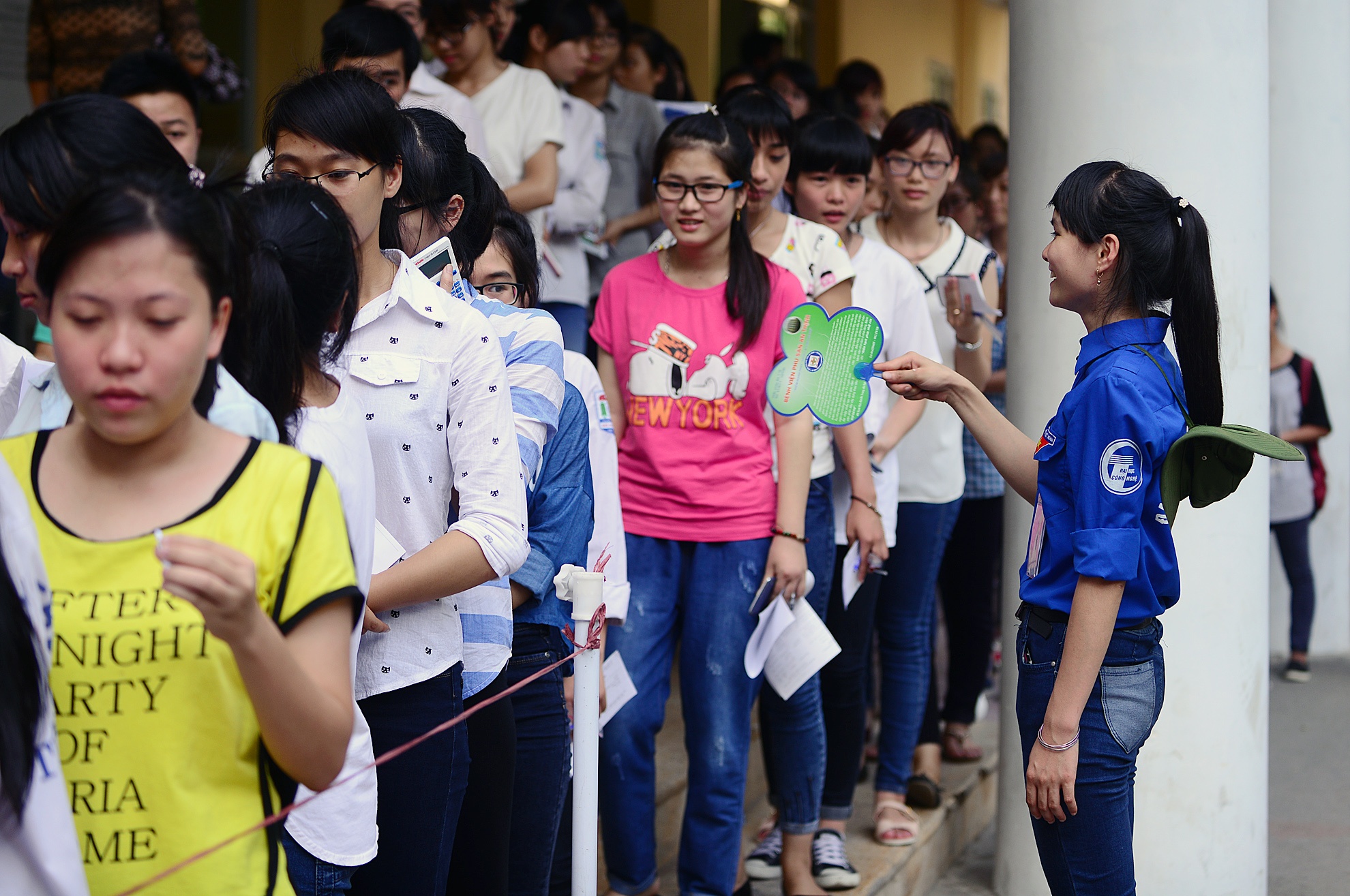 "Anh chị sinh viên tình nguyện rất nhiệt tình. Không chỉ dẫn đường, hướng dẫn làm thủ tục, họ còn quạt cho chúng em khi xếp hàng vào phòng thi", một thí sinh nói.