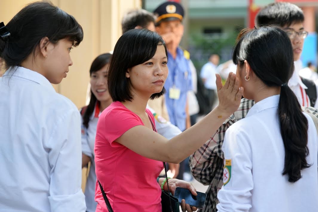| Sự âu yếm của người nhà đối với thí sinh đi thi. Ảnh: Hoàng Hà. |