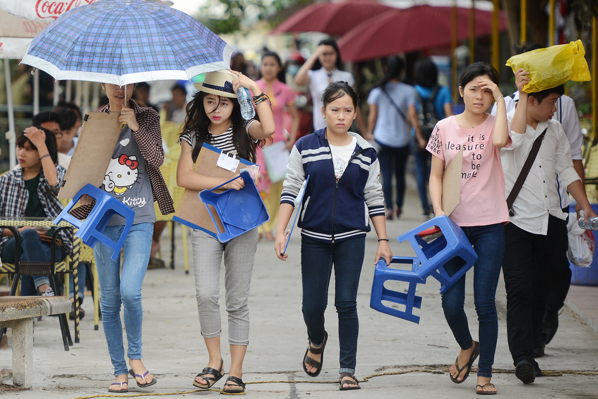 | Năm nay, thí sinh đăng ký thi tại trường sẽ xét tuyển môn Văn và thi 2 môn năng khiếu. Nhiều bạn lỉnh kỉnh với ghế ngồi, giá vẽ mang theo dự thi môn năng khiếu vẽ. |