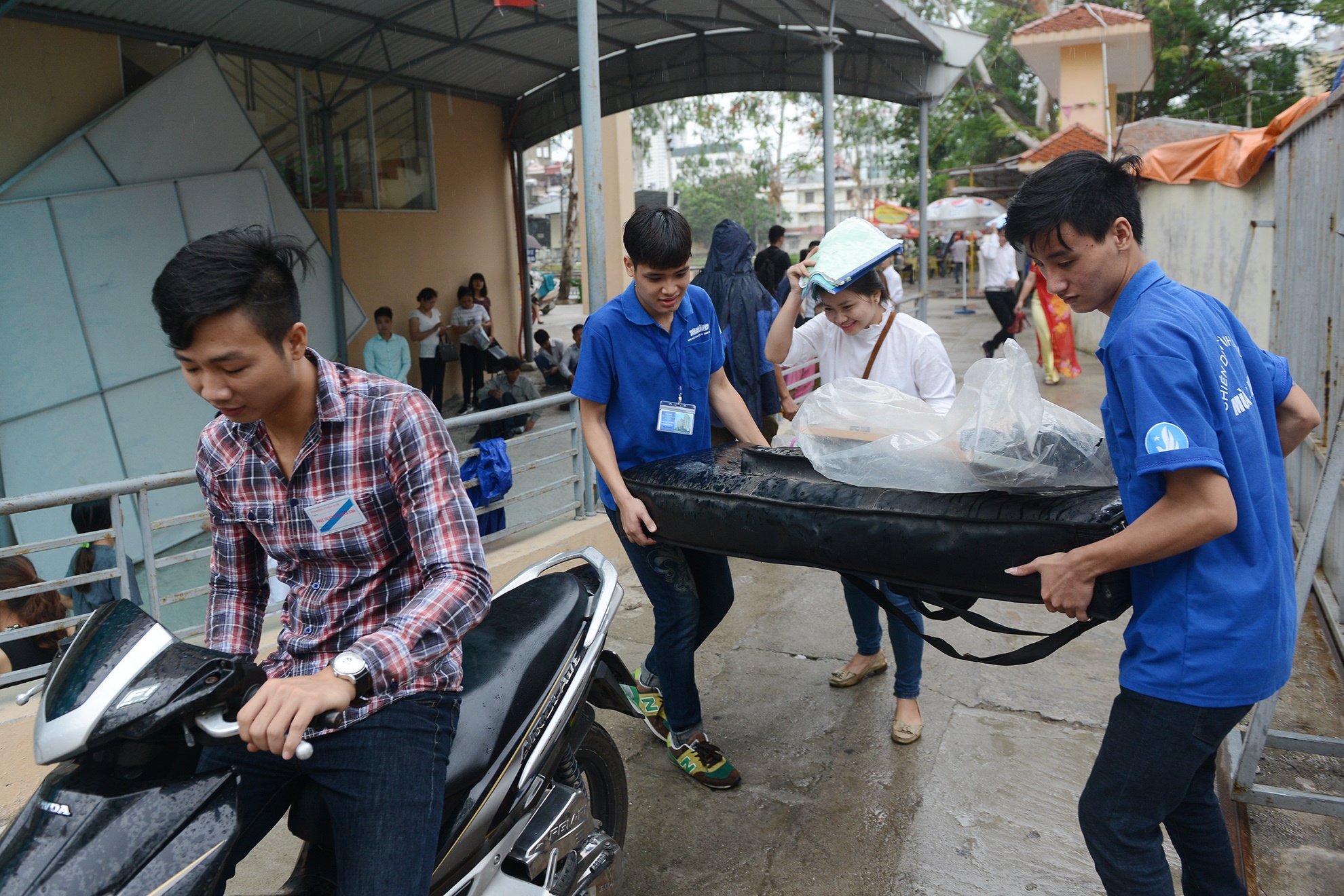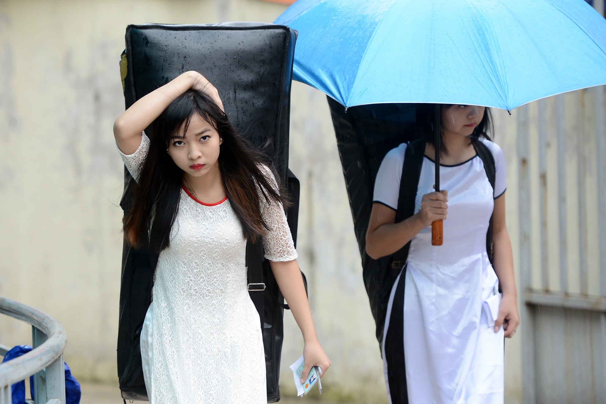 | Cơn mưa bất chợt từ sáng sớm khiến các bạn thí sinh vất vả hơn khi họ còn phải mang theo những đạo cụ cồng kềnh hỗ trợ cho phần thi năng khiếu của mình như đàn Organ, Piano... |