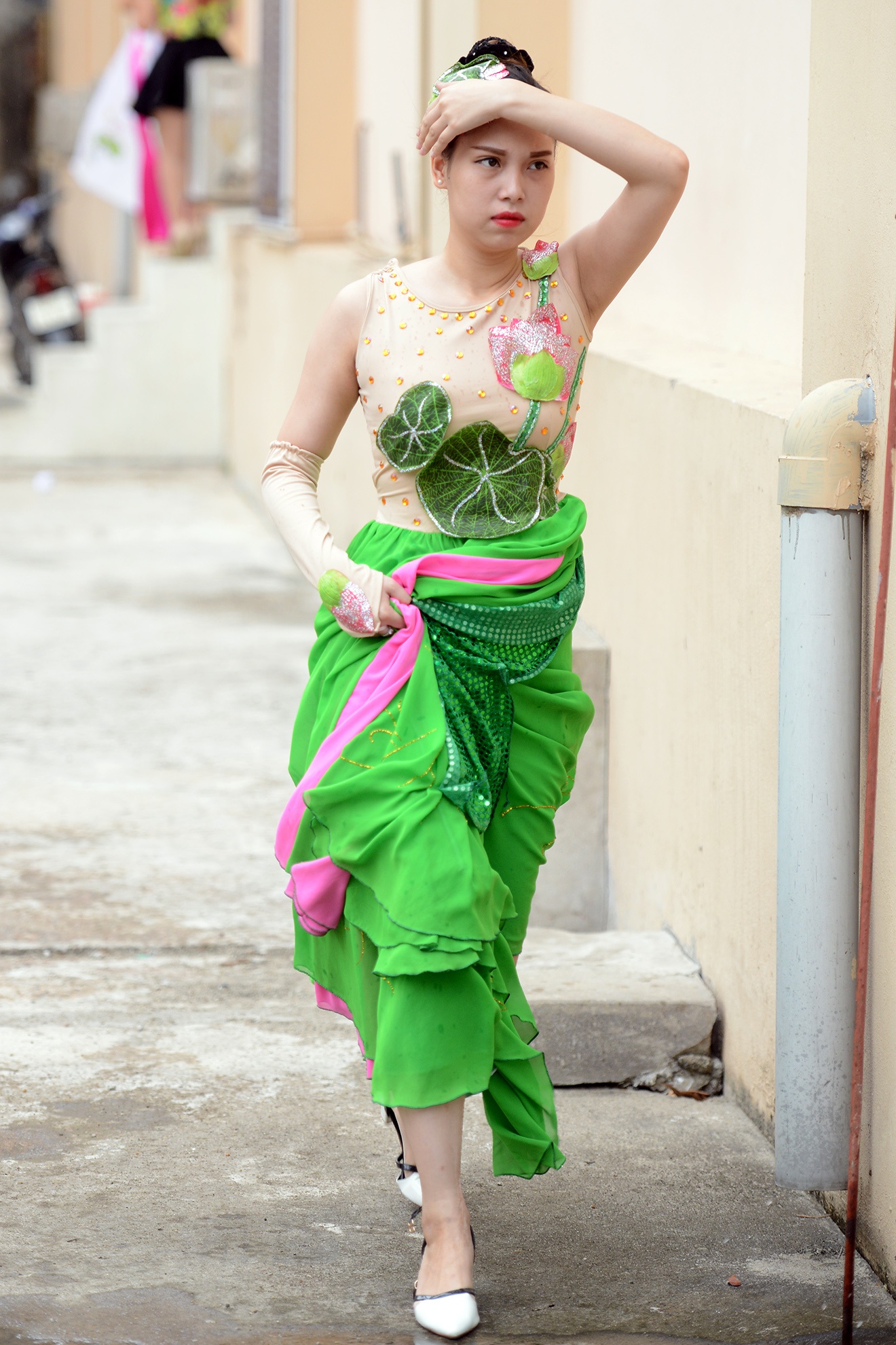 | Thí sinh nữ duyên dáng trong phục trang biểu diễn mang hình ảnh hoa sen đội mưa vào điểm thi. |