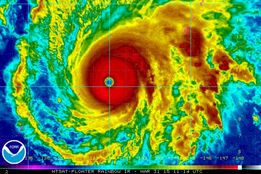 Theo các đài khí tượng, tâm bão Maysak sẽ quét qua khu vực đông bắc Manina trong ngày 5/4. Đây là cơn bão hình thành nhanh thứ 3 kể từ năm 1940. Ảnh: NOAA
