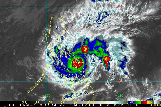 | Trung tâm Pagasa dự báo, khu vực tâm bão đi qua có thể có mưa lớn, lũ lụt, sạt lở đất, mất điện diện rộng và gián đoạn dịch vụ thông tin liên lạc. Mắt bão có thể quan sát rõ từ vũ trụ hôm 13/12. Ảnh: NOAA |