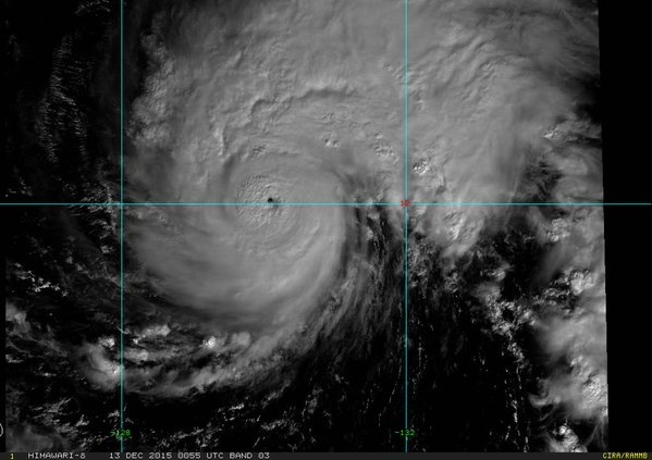 | Dựa trên ảnh vệ tinh của Đại học Wisconsin-Madison (Mỹ), Cơ quan khí tượng thủy văn quốc gia Philippines, Pagasa, ước tính bão Melor (tên địa phương là Nona) đang mạnh lên rất nhanh. Sức gió ở vùng gần tâm bão tăng từ 150 km/h lúc 3 giờ sáng 14/12 lên tới 220km/h lúc 10h20 cùng ngày. Ảnh: Pagasa |