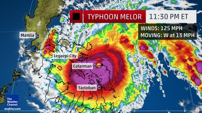 Bão Melor được dự báo có đường đi tương tự bão Haiyan, siêu bão cấp 5 đổ bộ vào miền trung Philippines khiến gần 8.000 người chết và mất tích năm 2013. Trong đêm nay, Melor dự kiến đổ bộ vào tỉnh Sorsogon, phía nam đảo chính Luzon. Vị trí tâm bão sáng 14/12. Ảnh: NOAA