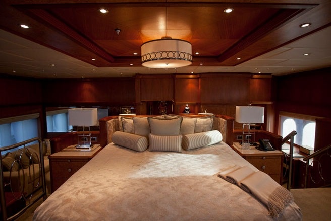 | Chiếc giường cỡ đại trong một phòng ngủ trên du thuyền Mi Sueno. |