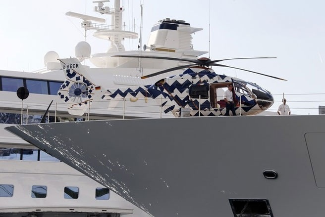 | Một chiếc trực thăng đang đậu trên boong của du thuyền có tên Quattroell. |