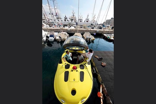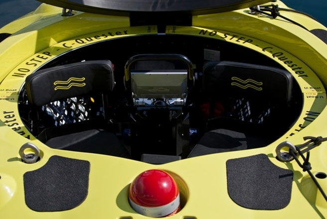 | Khách tham quan thử ngồi lên chiếc tàu ngầm U-boat Worx C-Quester, một phụ kiện của du thuyền . |