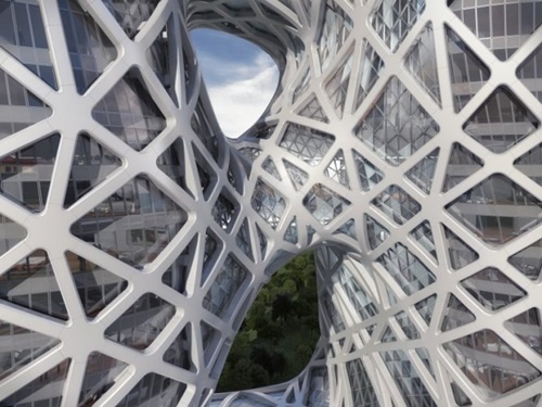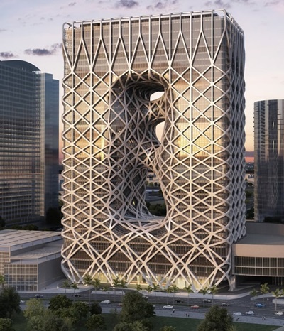| Hình khối đan xen kèm những nét uốn lượn khiến tòa tháp trở nên vô cùng ấn tượng. |