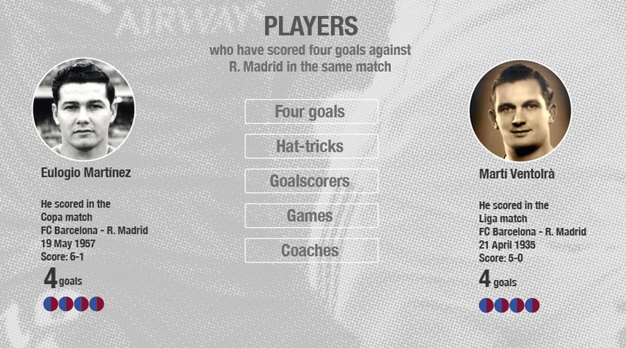| Có hai cầu thủ Barca từng ghi 4 bàn trong lịch sử siêu kinh điển là Eulogio Martinez và Marti Vantolra. Eulogio lập poker trong trận thắng 6-1 ngày 19/5/1957 ở Cúp nhà vua, trong khi Marti ghi 4 bàn trong trận thắng 5-0 tại La Liga ngày 21/4/1935. Đồ họa: Fcbarcelona. |