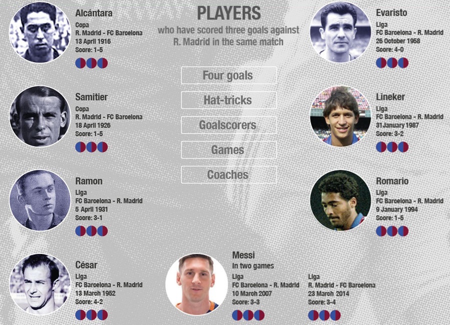 | 8 cầu thủ Barca từng lập hat-trick vào lưới Real gồm Alcantara, Evaristo, Samitier, Lineker, Ramon, Cesar, Romario và Lionel Messi. Riêng Messi hai lần lập hat-trick ở mùa 2006/07 và 2013/14, bằng thành tích của Di Stefano của Real. Đồ họa: Fcbarcelona. |