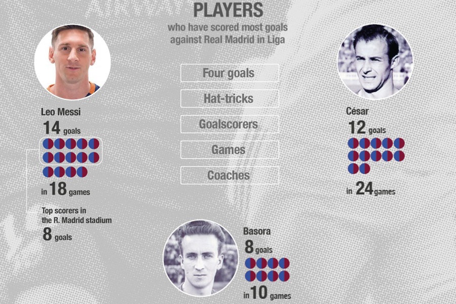| Messi là cầu thủ Barca ghi nhiều bàn thắng vào lưới Real Madrid nhất ở đấu trường La Liga - 14 bàn sau 18 trận (8 bàn tại Bernabeu). Cesar đứng thứ 2 với 12 bàn (24 trận). Vị trí thứ 3 thuộc về Basora với 8 bàn sau 10 trận. Đồ họa: Fcbarcelona. |