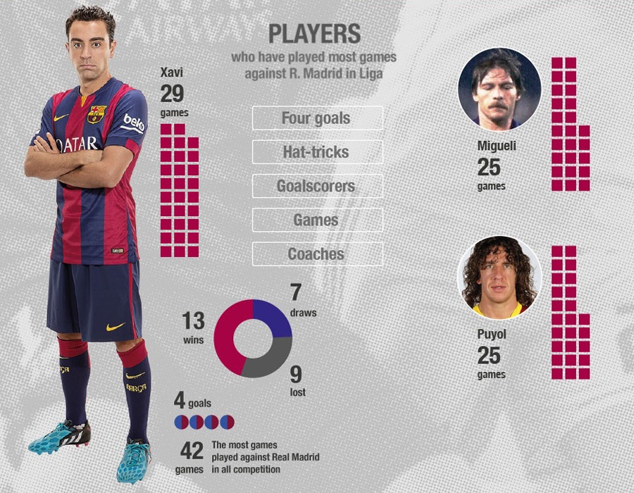 | Xavi là cầu thủ Barca tham dự El Clasico tại La Liga nhiều nhất với 29 lần (ghi 4 bàn). Sự góp mặt của anh giúp Barca thắng 13 hòa 7 thua 9. Xavi cũng là cầu thủ tham dự siêu kinh điển nhiều nhất trên mọi đấu trường với 42 lần. Hiện lão tướng người Tây Ban Nha đầu quân cho Al Sadd (Qatar). Theo đó, trận cầu đêm nay là lần đầu tiên Xavi không dự siêu kinh điển sau 15 năm. Đồ họa: Fcbarcelona. |
