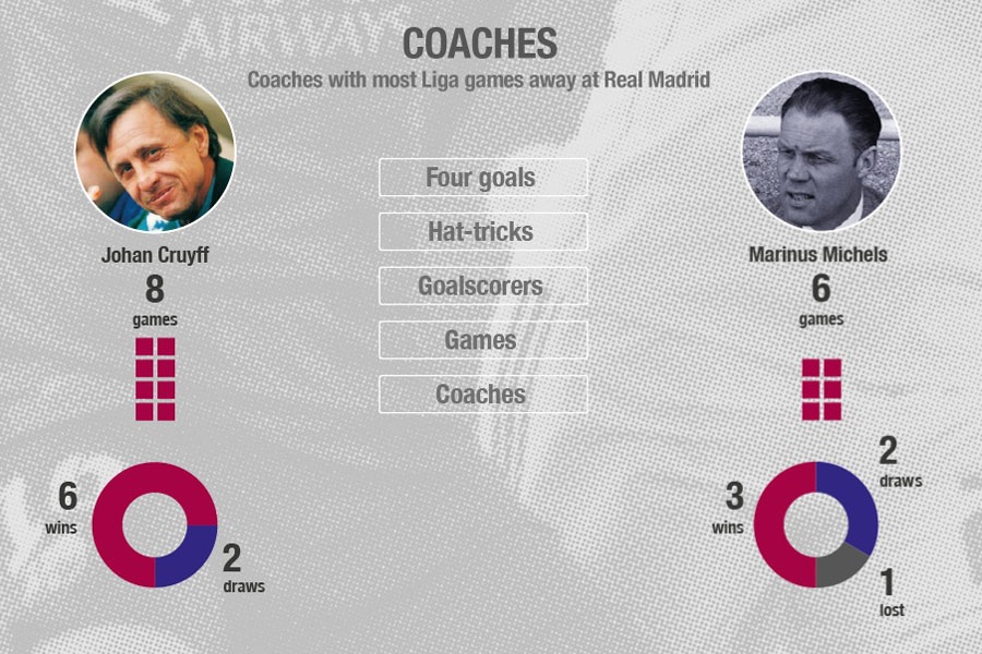 | Johan Cruyff là HLV Barca tham dự nhiều trận siêu kinh điển nhất - 8 lần với thành tích thắng 6, hòa 2. Đứng thứ hai là Marinus Michels với 6 lần (thắng 3, hòa 2, thua 1. Đồ họa: Fcbarcelona. |