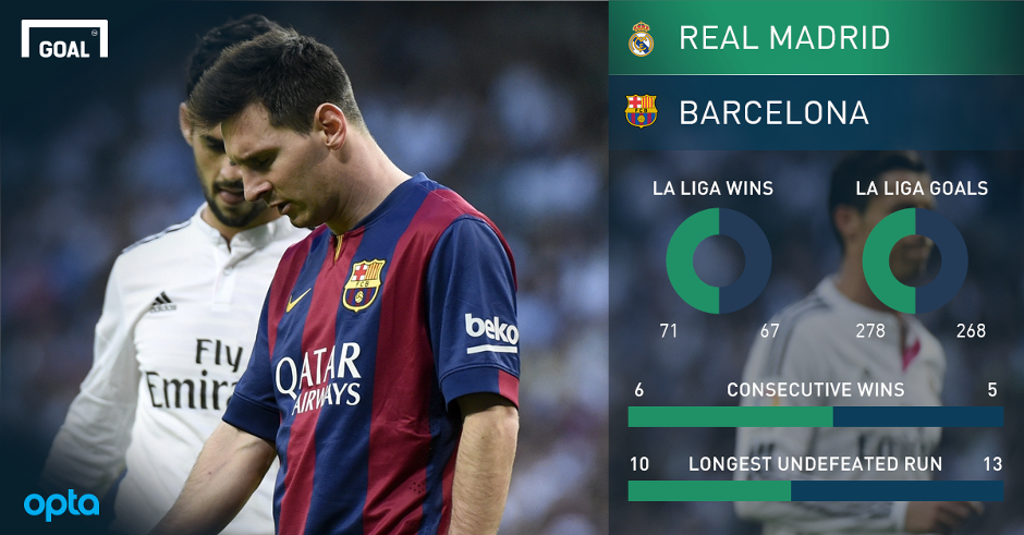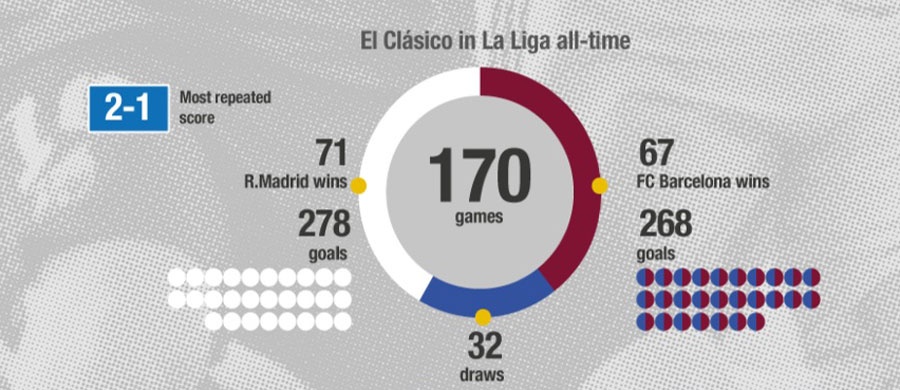| Trong 170 lần đối đầu tại La Liga trước đây, Real Madrid thắng 71 trận, ghi 278 bàn. Barca thắng 67 trận, ghi 268 bàn. 32 trận kết thúc với tỷ số hòa. Tỷ số 2-1 được lặp lại nhiều nhất. Đồ họa: Fcbarcelona. |