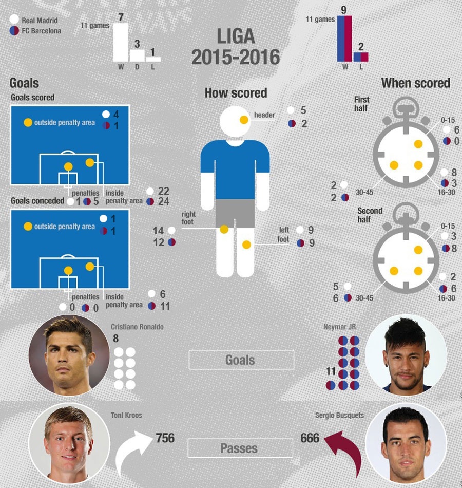 | Tại giải năm nay, Real thắng 7, hòa 3, thua 1 sau 11 vòng đấu (ghi 26 bàn, lọt lưới 7). Barca thắng 9, thua 2 (ghi 25 bàn, lọt lưới 12). Ronaldo đang là chân sút tốt nhất của Real với 8 pha lập công, trong khi Neymar dẫn đầu danh sách Pichichi với 11 bàn thắng. Toni Kroos là người chuyền nhiều nhất của Real với 756 lần. Bên phía Barca là Sergio Busquets (666). Đồ họa: Fcbarcelona. |