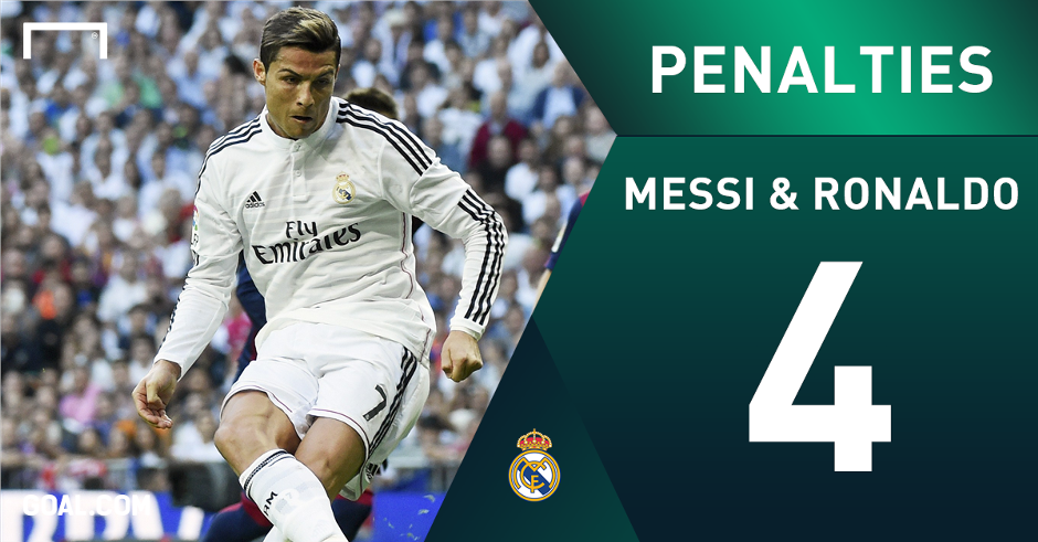 | Cả Lionel Messi lẫn Cristiano Ronaldo đều ghi 4 bàn trên chấm penalty trong những lần tham dự siêu kinh điển, hơn bất kỳ cầu thủ nào từng góp mặt ở trận này. Tính đến nay, siêu sao người Bồ Đào Nha sút tung lưới Barca 15 lần trên mọi đấu trường. Đồ họa: Goal. |