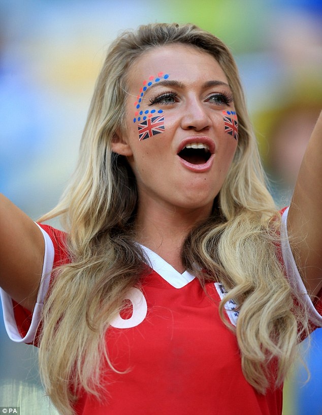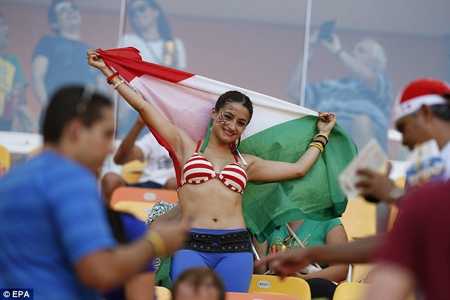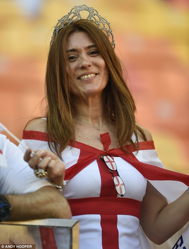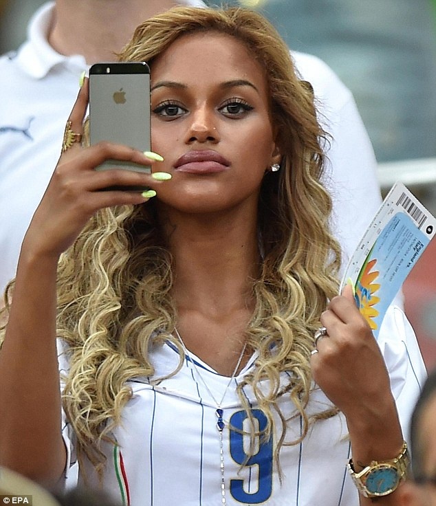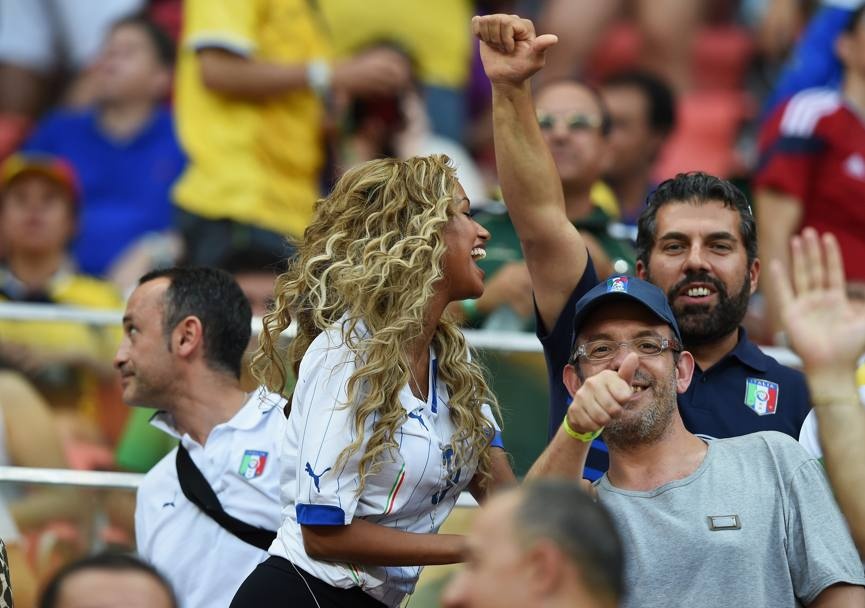 | Cô mặc chiếc áo của ĐT Italy đến sân Arena Amazonia tiếp sức cho tiền đạo khoác áo số 9 của ĐT Italy trong trận gặp Anh. |