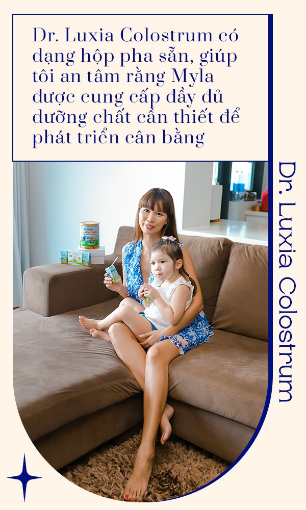 - Đứng trước biển thông tin, tôi được các chuyên gia dinh dưỡng khuyến nghị tập trung 3 yếu tố quan trọng nhất trong giai đoạn đầu đời, đó là tiêu hóa, đề kháng và trí thông minh. Tôi hy vọng cha mẹ nào cũng biết được điều này trước khi có con. Đó là lý do tôi yên tâm khi chọn cho Myla sản phẩm dinh dưỡng Dr. Luxia Colostrum của Công ty US Cali.