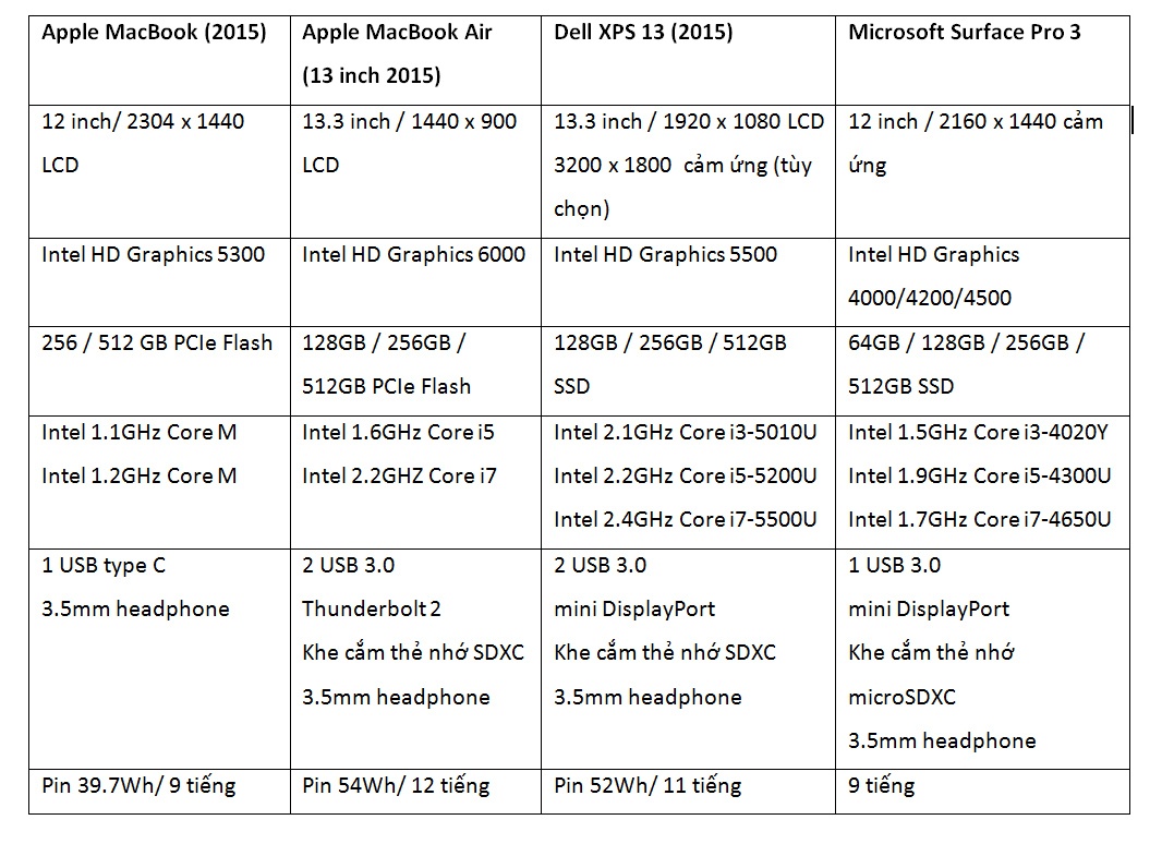 Một số khác chọn chiếc Surface Pro 3 làm đối thủ cho MacBook. Thiết bị này mang đến sự linh hoạt lớn hơn so với nhiều mẫu notebook hiện nay bởi tiền thân của nó vẫn là một chiếc tablet. Dưới đây là bảng so sánh cấu hình của MacBook với một số sản phẩm được xem là đối thủ: