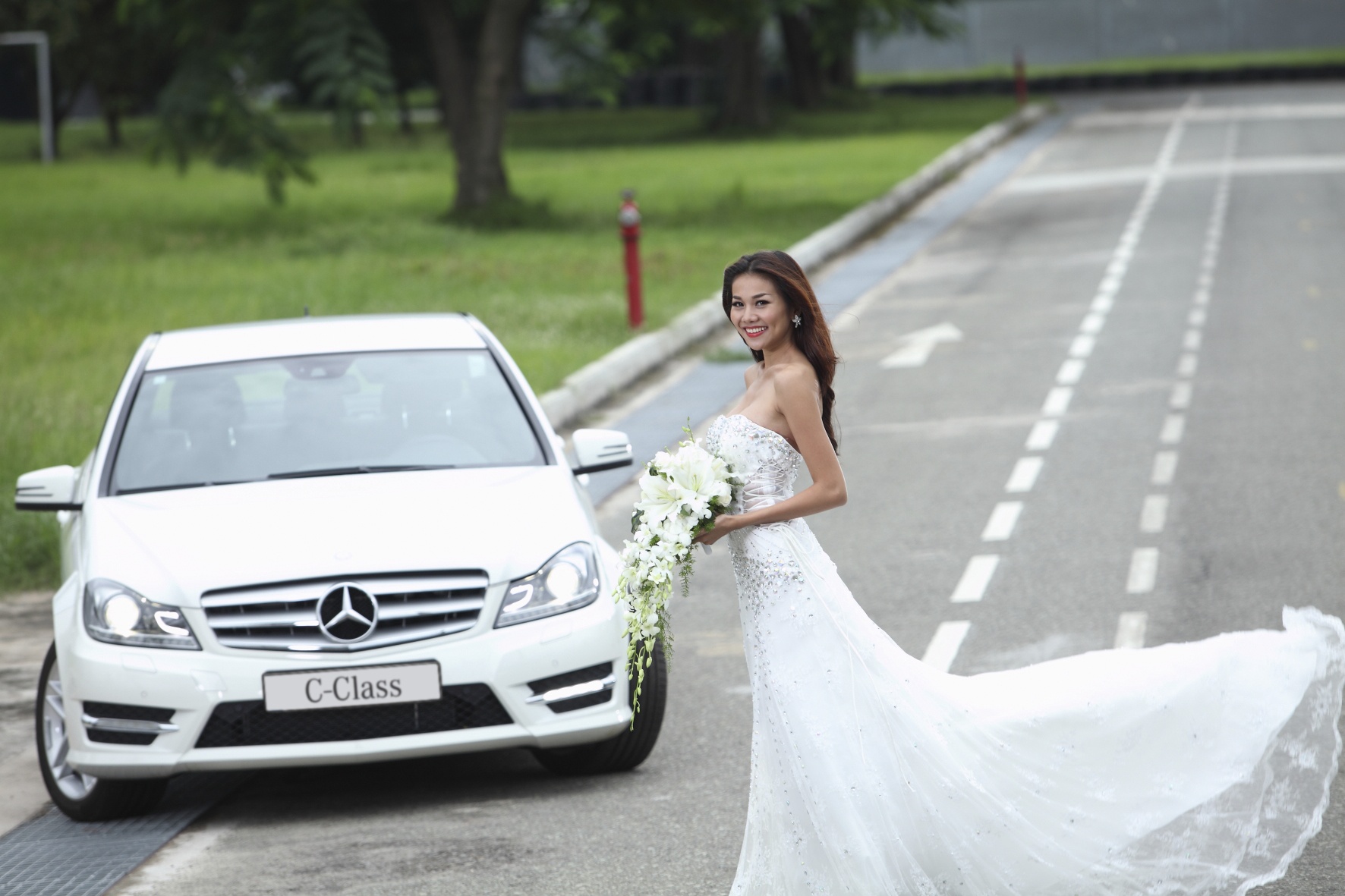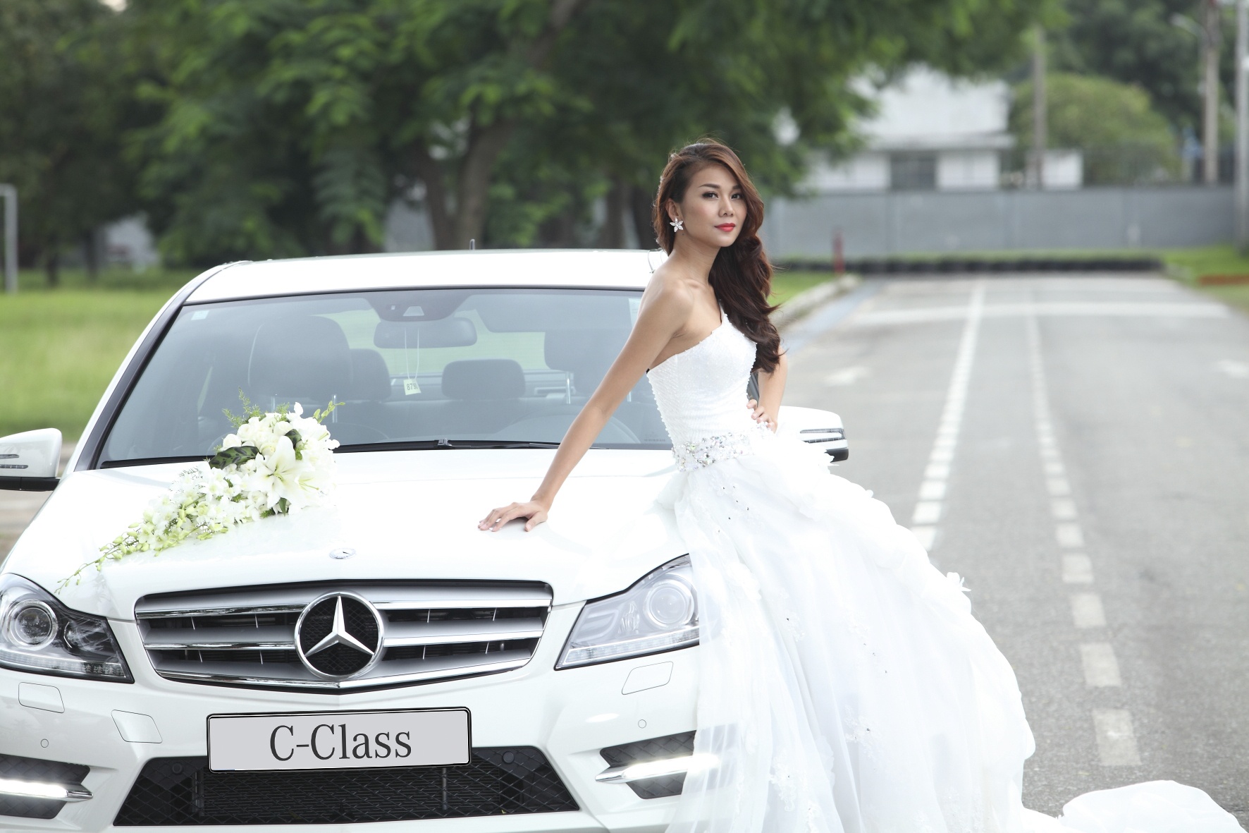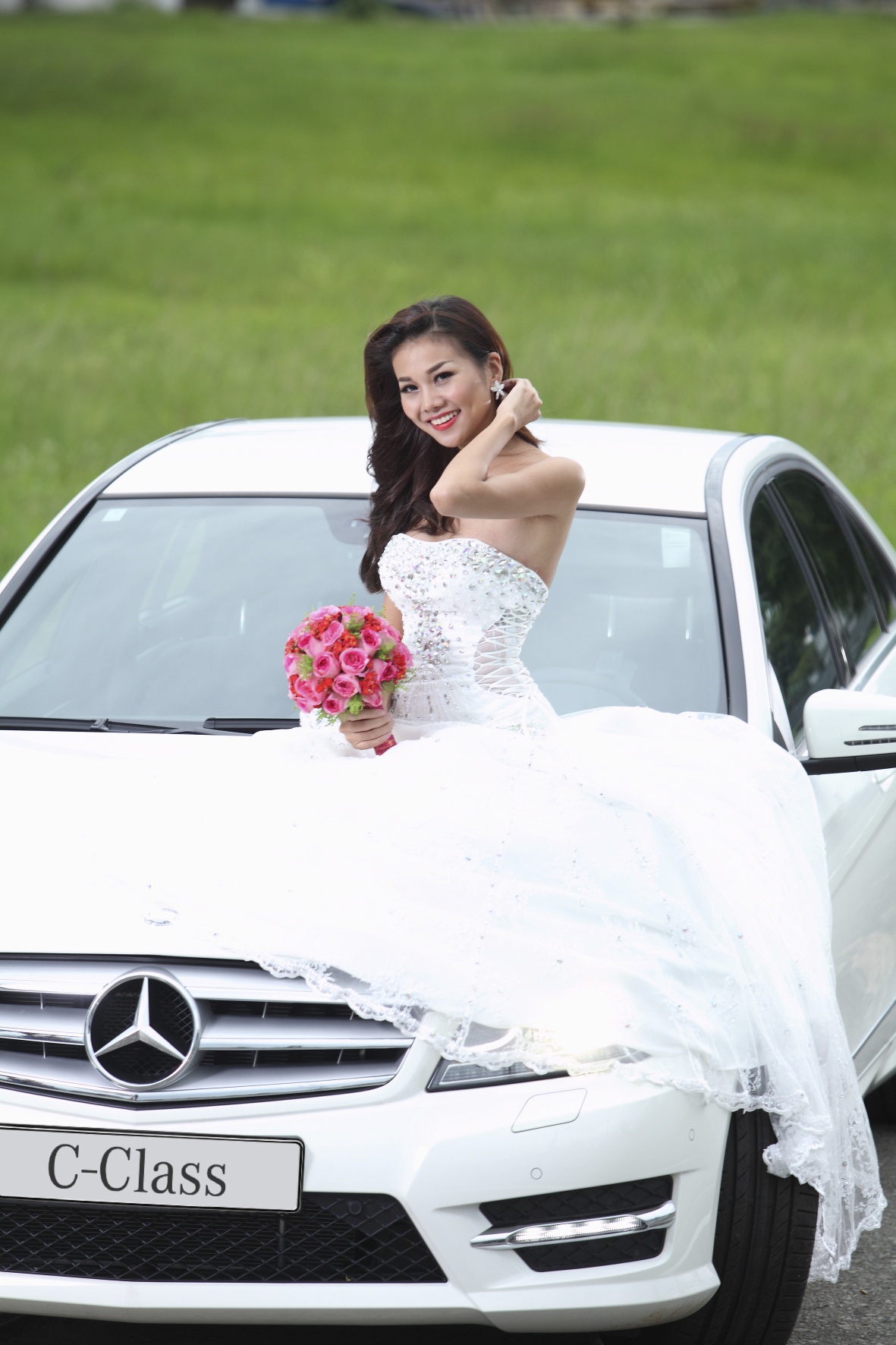 Giám khảo chương trình Next Top Model gợi cảm với trang phục cưới tạo dáng bên chiếc xe trẻ trung Mercedes-Benz C-Class.