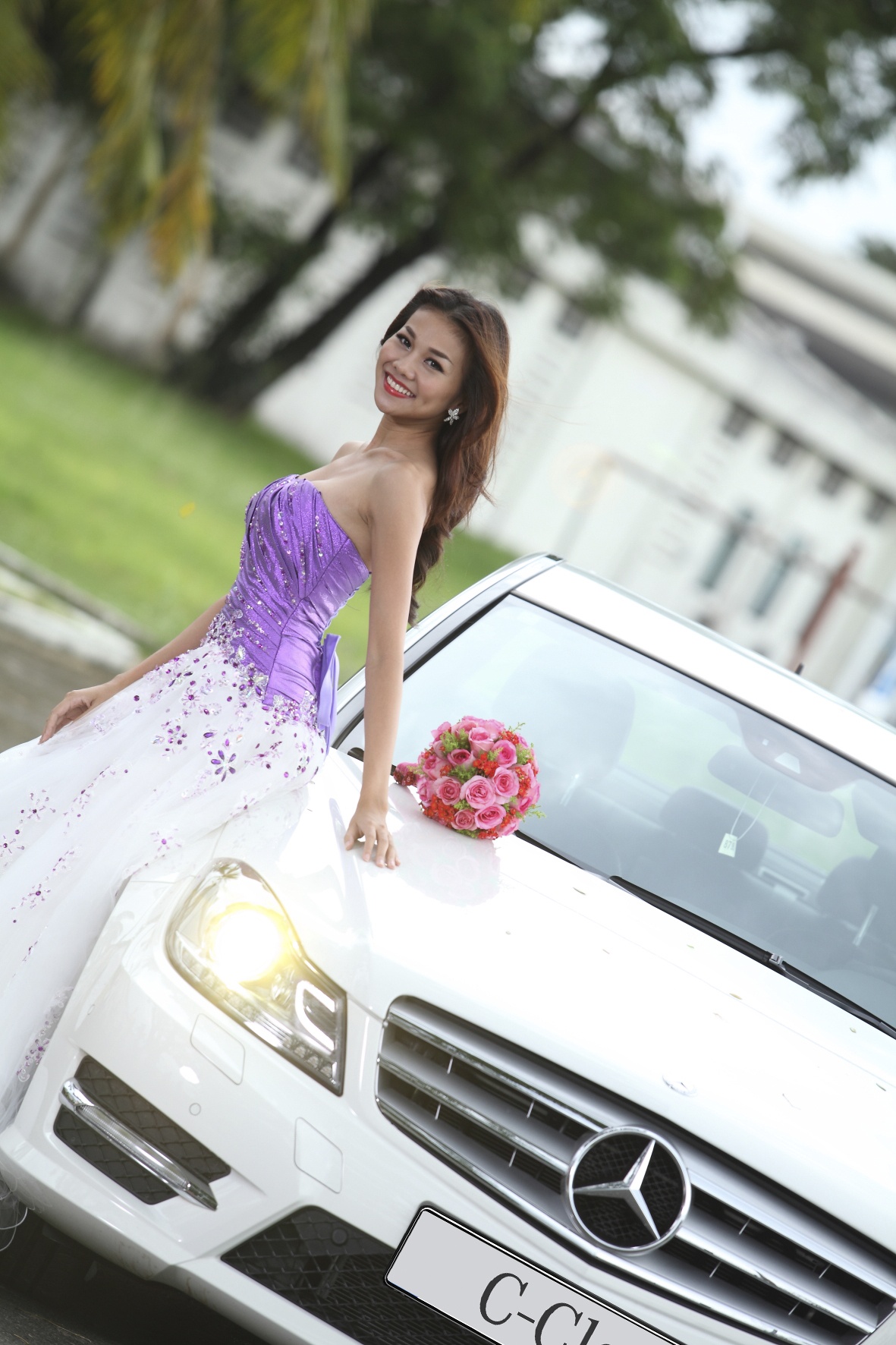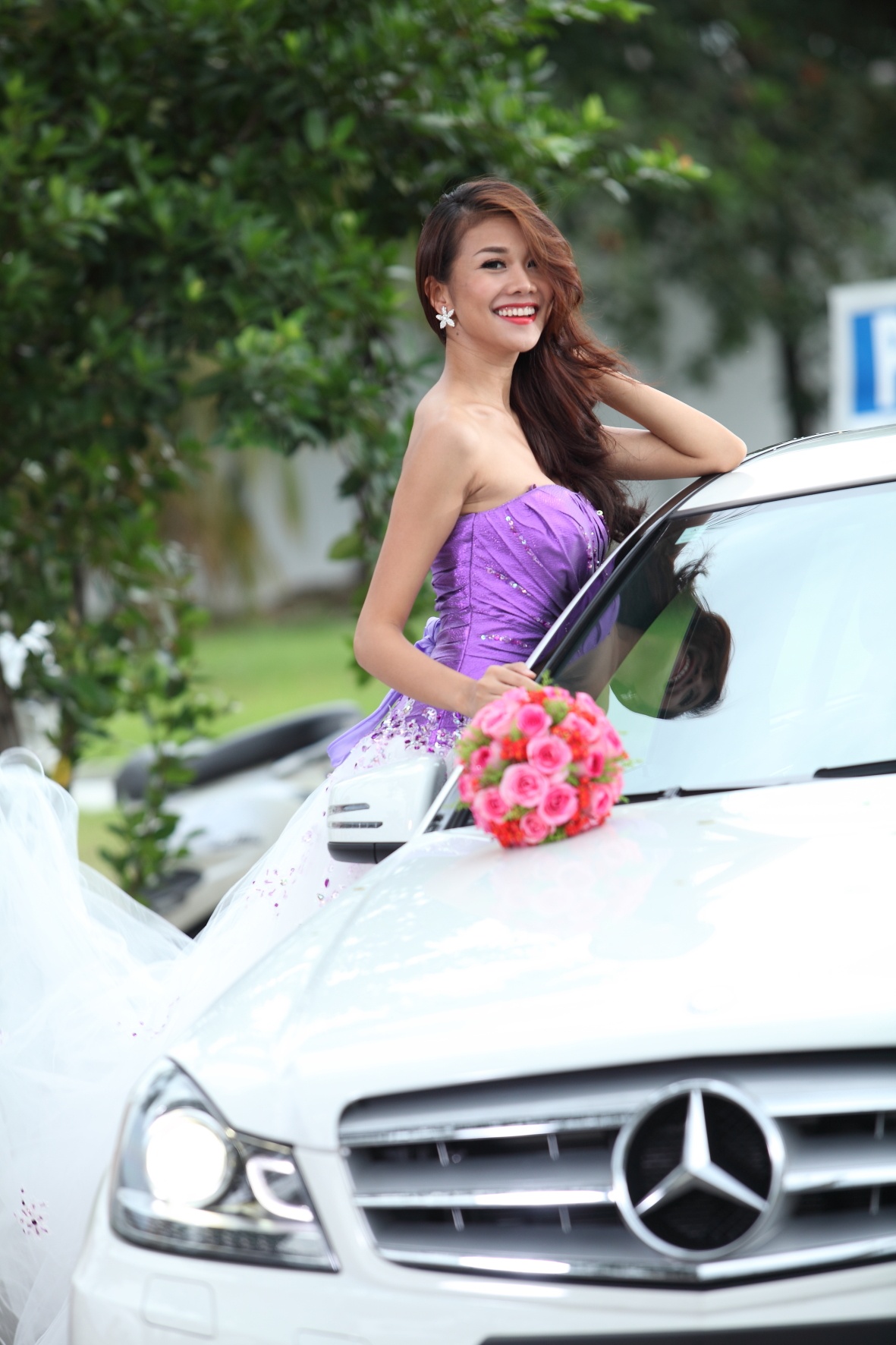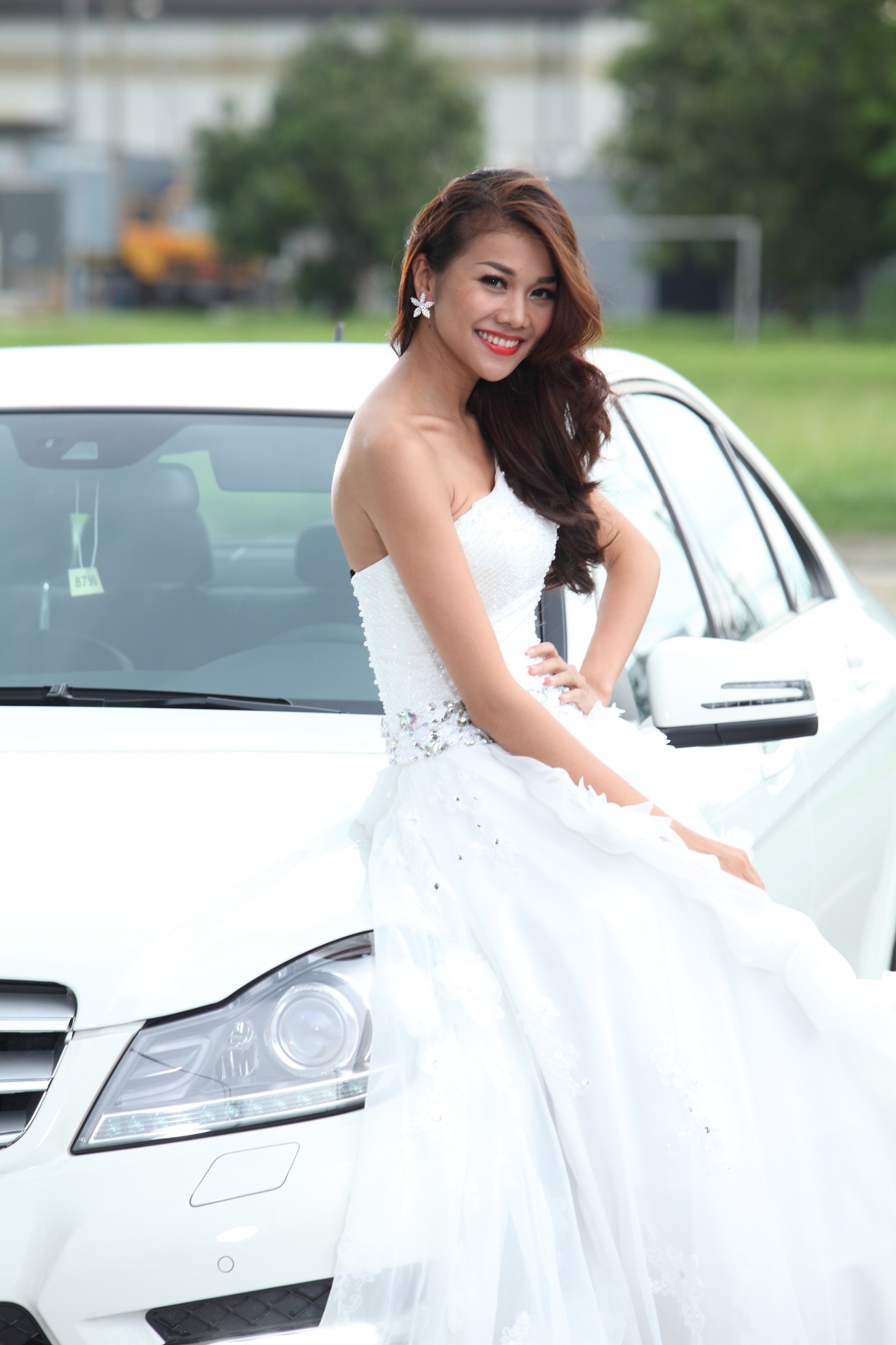 Giám khảo chương trình Next Top Model gợi cảm với trang phục cưới tạo dáng bên chiếc xe trẻ trung Mercedes-Benz C-Class.