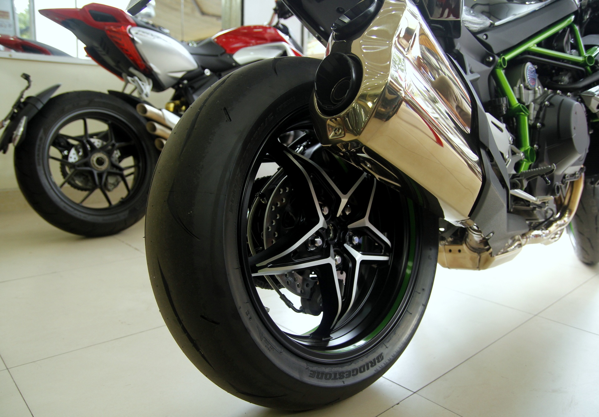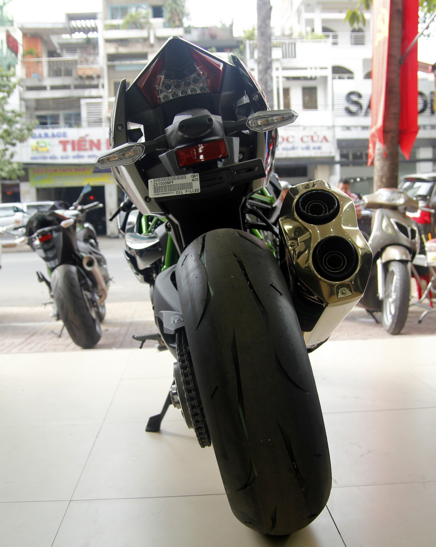 | Pô xe được đặt bên phải, hai họng pô lớn tạo ra âm vực thấp, mạnh mẽ. Vành xe có thiết kế năm chấu kép hình ngôi sao. H2 được trang bị lốp dành cho đường đua của hãng Bridgestone, kích thước 120/70ZR17 phía trước và 200/55ZR17 phía sau. |
