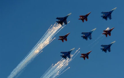 | Su-27 và MiG-29 của đội bay trình diễn mang tên các Hiệp sĩ Nga. |