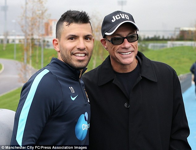| Tiền đạo Sergio Aguero tận dụng hội có một không hai để giao lưu với ngôi sao phim võ thuật. Chân sút người Argentina sẵn sàng tham dự đại chiến Liverpool sau 6 tuần dưỡng thương gân khoeo. |