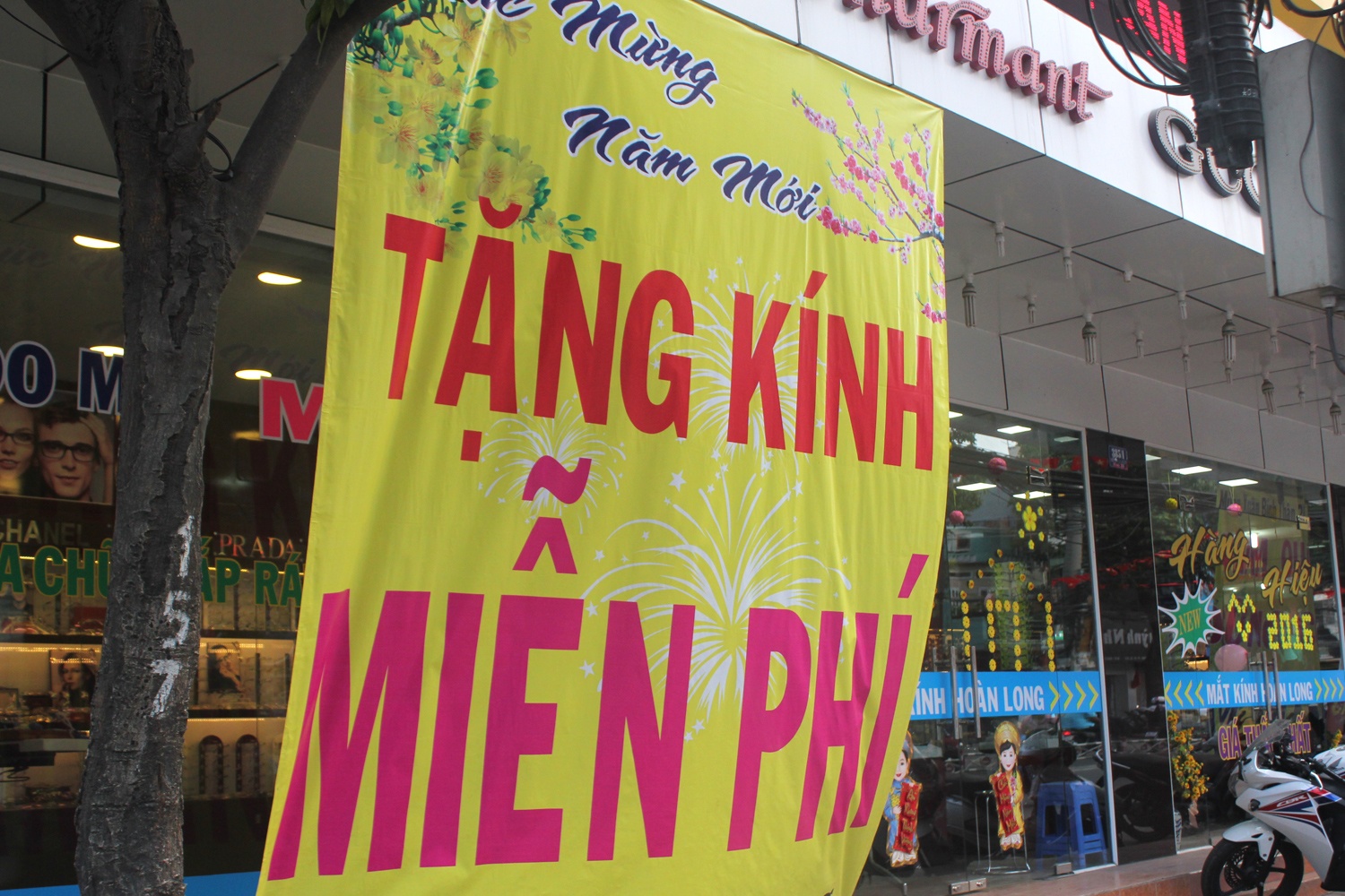 | Một cửa hàng kính mát trên đường Quang Trung, Gò Vấp còn tặng kính miễn phí cho khách hàng mua sắm Tết. |