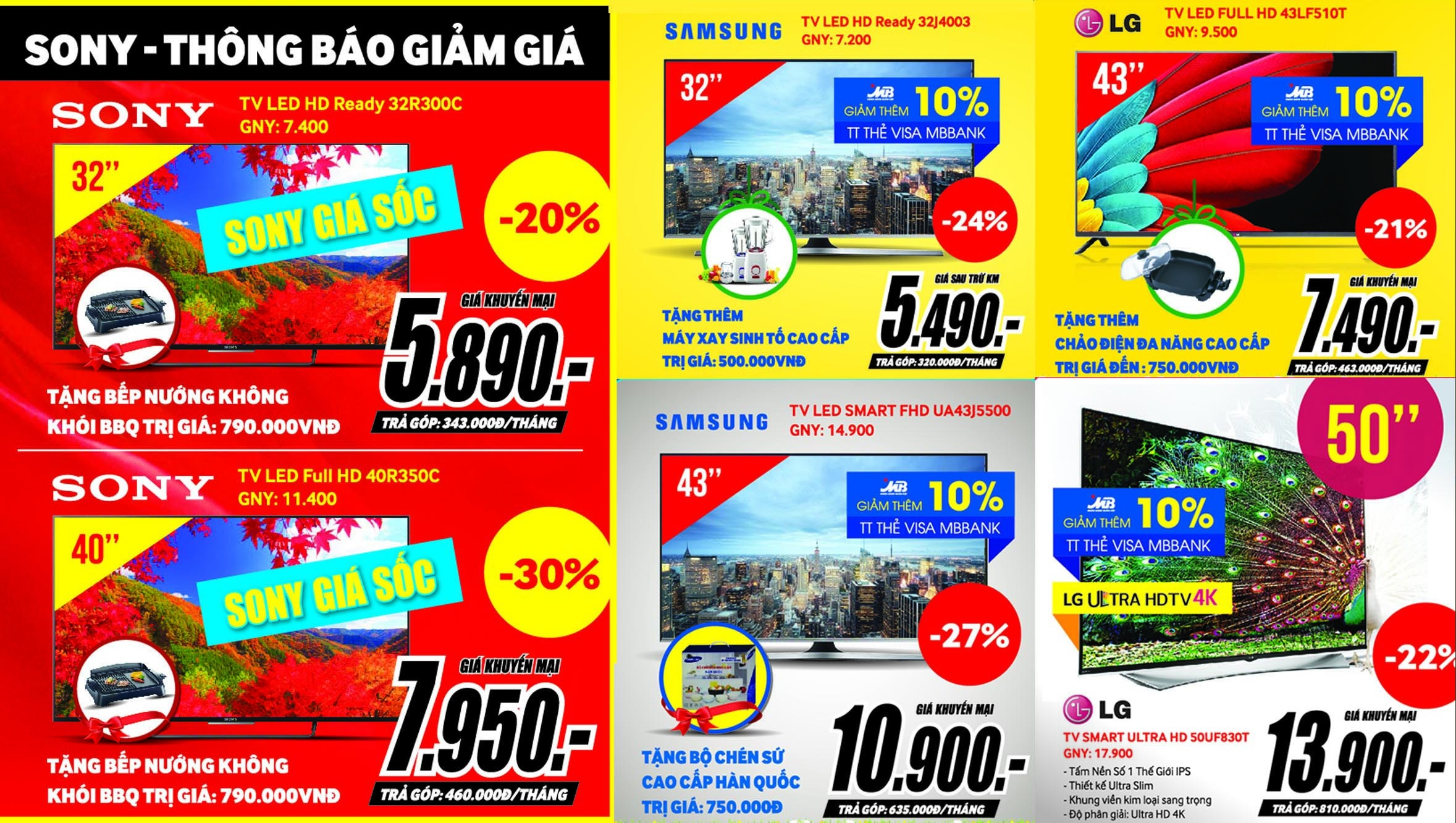 Với quy mô lớn, chuỗi siêu thị trên toàn quốc và chính sách hỗ trợ tốt từ các hãng, từ ngày 5/12 đến hết 11/12, hệ thống siêu thị này tiếp tục công bố sự kiện tài trợ mua sắm lớn nhất trong năm với mức giảm giá lên đến 40% cho hàng loạt dòng TV LED của Sony, Samsung, LG. Cụ thể, TV LED 32 inch Sony 32R300C giảm 20% còn 5,89 triệu đồng tặng bếp nướng không khói BBQ trị giá 790.000 đồng; TV LED 40 inch Sony 40R350C giảm 30% còn 7,95 triệu đồng tặng bếp nướng không khói BBQ; TV LED 32 inch Samsung 32J4003 giảm 24% còn 5,49 triệu đồng tặng máy xay sinh tố cao cấp; TV LED Smart FHD 43 inch Samsung UA48J5500 giảm 27% còn 10,9 triệu đồng tặng bộ chén sứ cao cấp Hàn Quốc; TV LED Smart Ultra HD 50 inch LG50UF830T giảm 22% giá còn 13,9 triệu đồng; TV LED FullHD LG 43LF510T giảm 21% còn 7,49 triệu đồng tặng chảo điện đa năng…