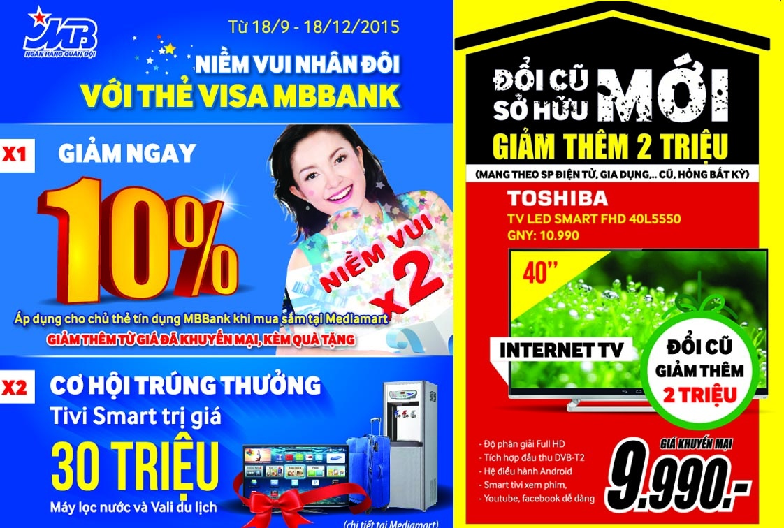 Chưa dừng ở đó, các siêu thị điện máy còn hợp tác với ngân hàng mang đến ưu đãi mua sắm hiện đại và tiết kiệm cho khách hàng trong dịp cuối năm. Theo đó, bên cạnh mức giá giảm sâu và quà tặng giá trị, khi mua sắm các sản phẩm điện tử, công nghệ tại MediaMart thanh toán qua thẻ Visa ANZ, MBBank, ShinhanBank, SeaBank…, khách hàng sẽ được giảm thêm 10% khi chi tiêu. Ngoài ra, khách hàng còn dễ dàng mua sắm với chương trình hỗ trợ tài chính Mua trước trả sau - ưu đãi lãi suất 0% lên tới 6 tháng.