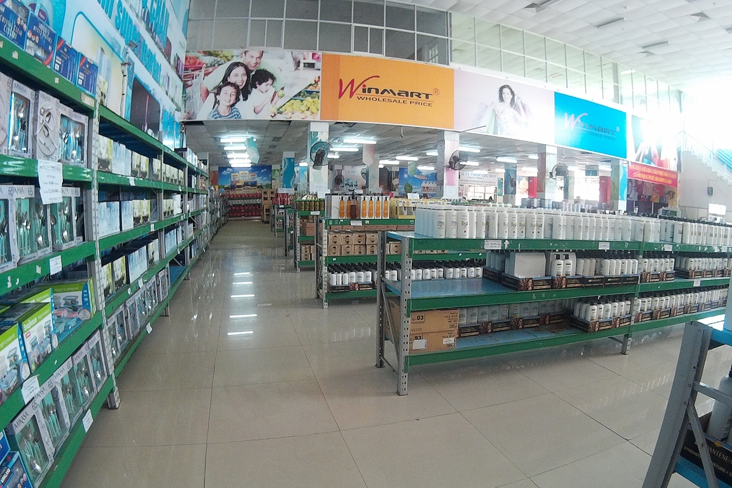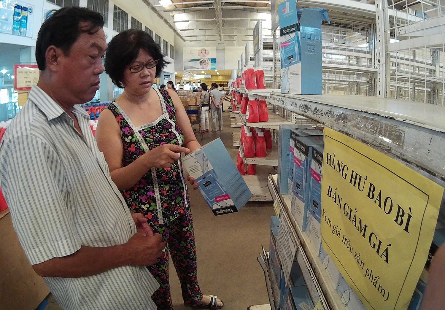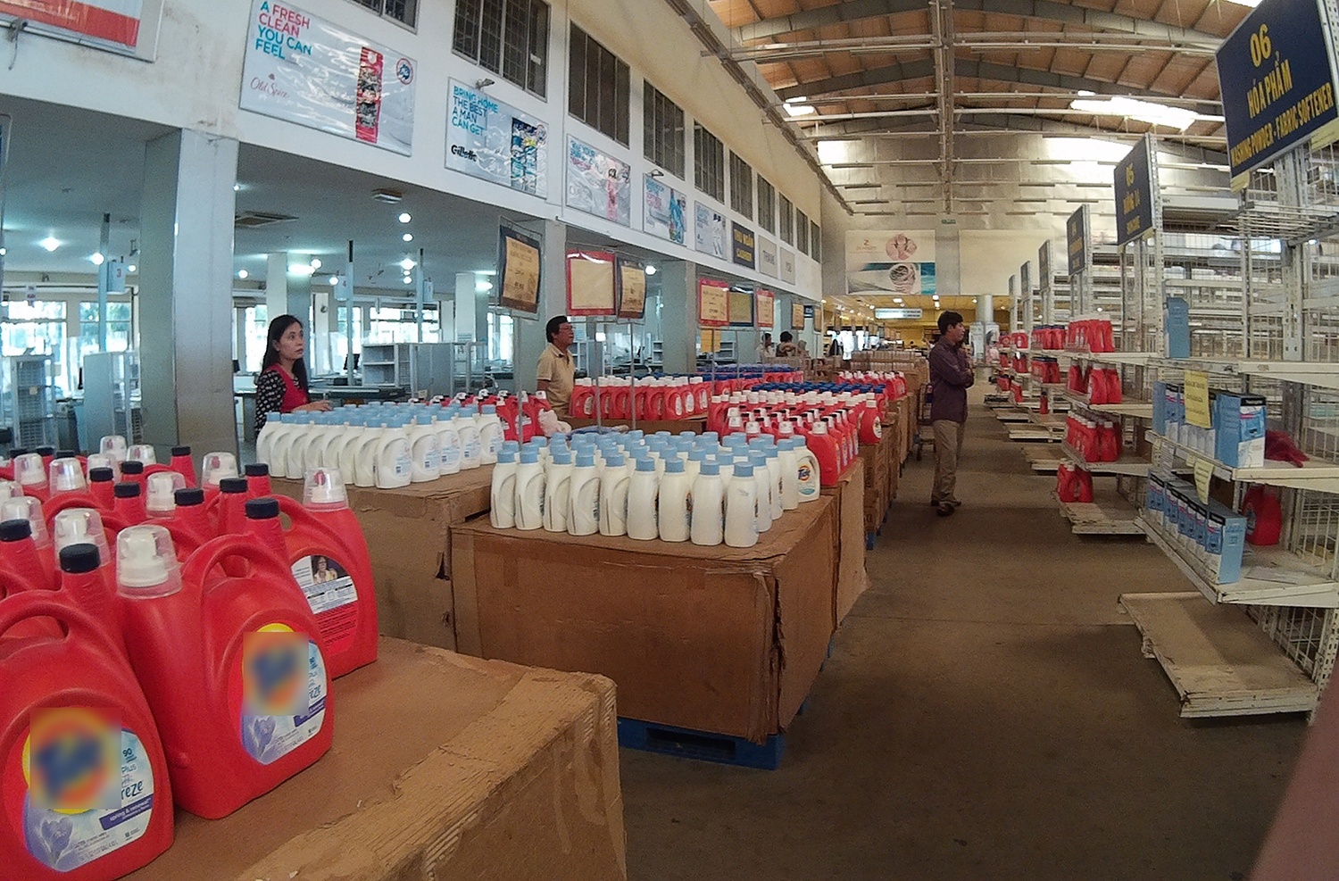 | Bên trong siêu thị chỉ còn một dãy hàng được bày bán, chủ yếu là các loại hóa mỹ phẩm như bột giặt, nước xả vải, thuốc nhuộm tóc... Tất cả được treo biển giảm giá đến 50%. |