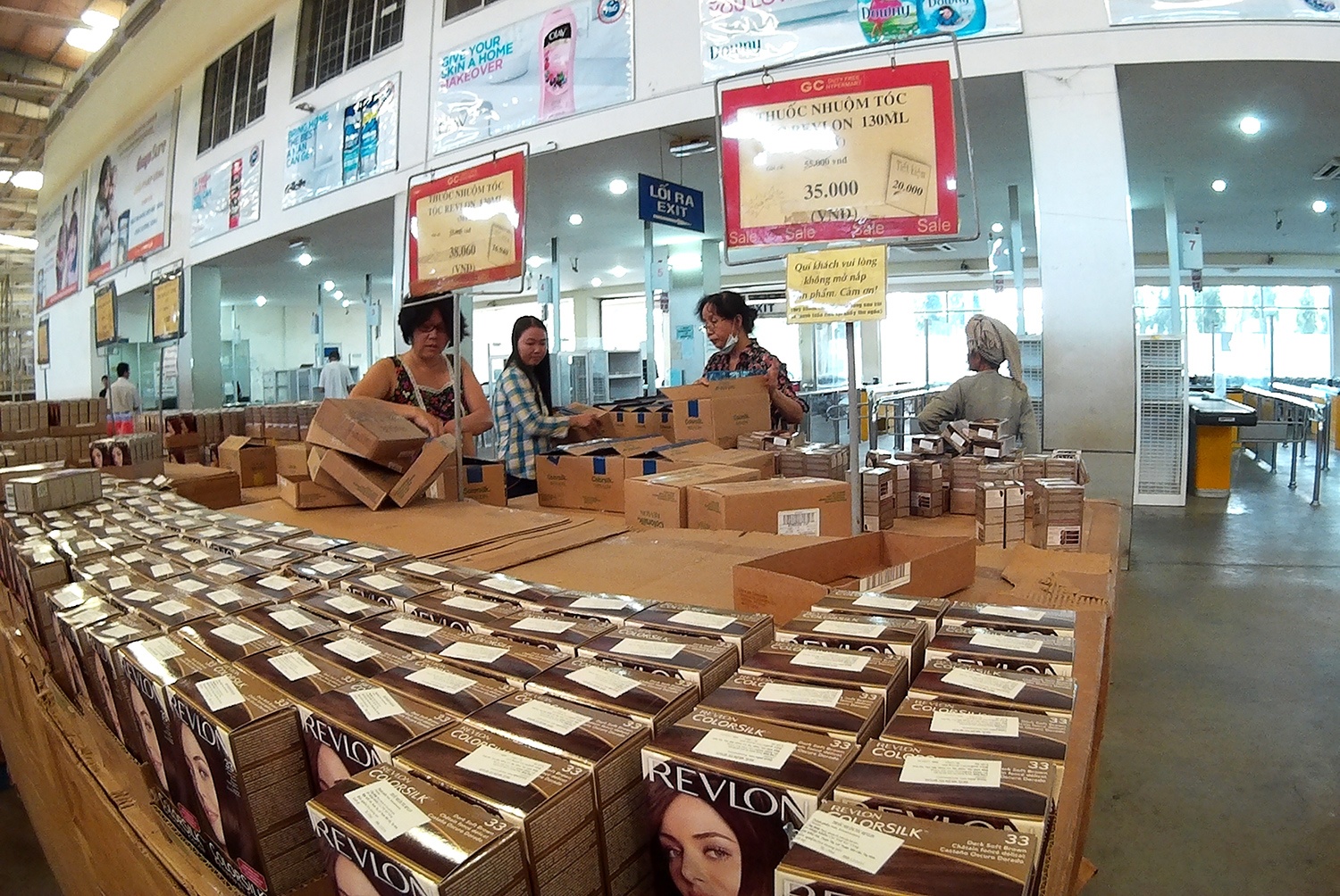 Mặt hàng còn bày nhiều nhất tính đến thời điểm này là thuốc nhuộm tóc, được bán 35.000 đồng một hộp. Khá nhiều khách chọn mua luôn cả thùng.